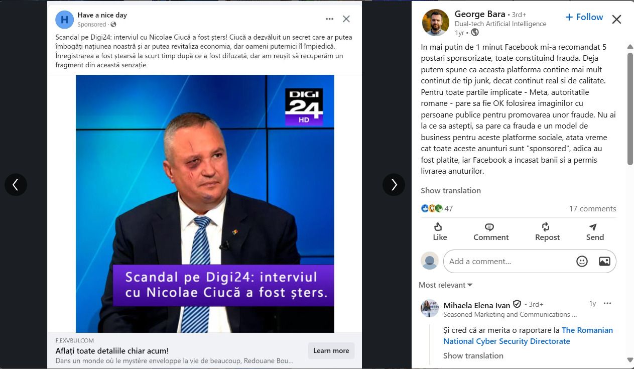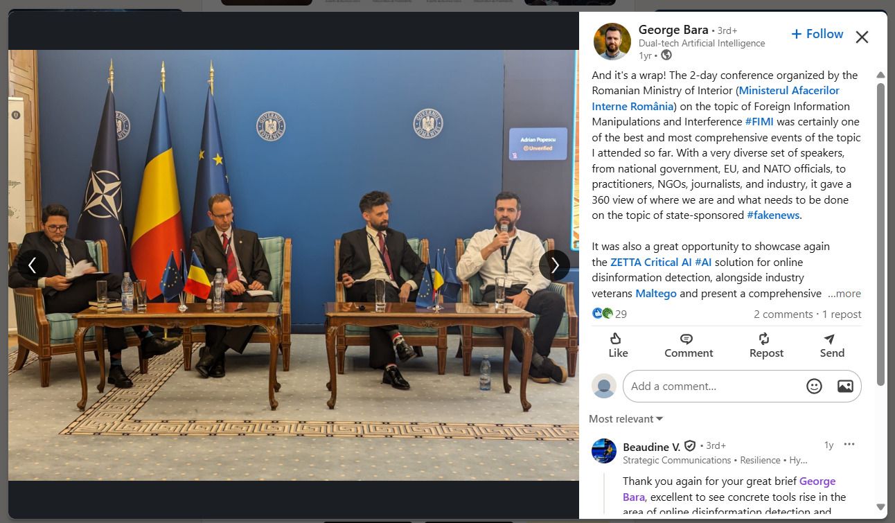 George Bara a fost invitat, în calitate de expert în lupta cu fake news-ul, la mai multe evenimente ale instituțiilor de forță din România. Captură de ecran via LinkedIn