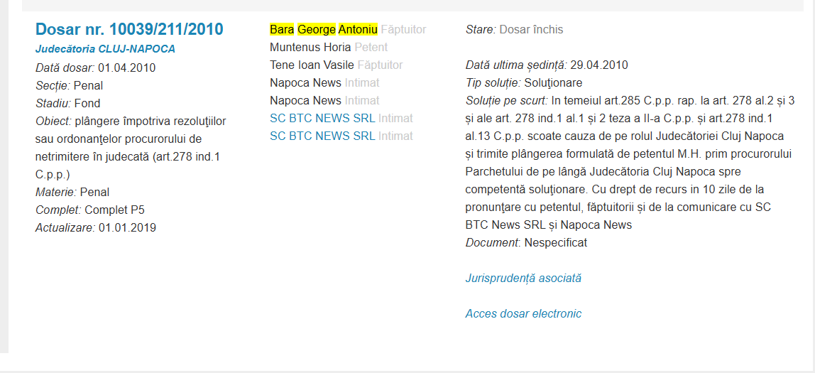Cu toate acestea, numele firmei BTC News apare într-un proces penal din 2010 în care pârâții sunt Țene, Bara alături de NapocaNews.