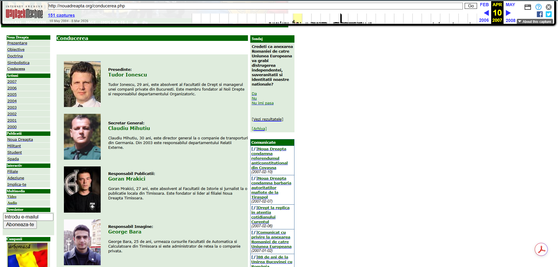 Versiuni mai vechi ale site-ului nouadreapta.org — indexate de Wayback Machine — arată, la rândul lor, că filiala bihoreană a organizației Noua Dreaptă era condusă între 2005 și 2007 de George Bara.