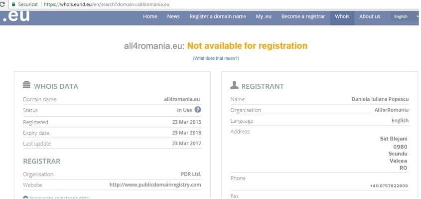 M-am întrebat al cui este all4romania.eu − și l-am găsit pe un site de tip WhoIs pentru domeniile .eu: