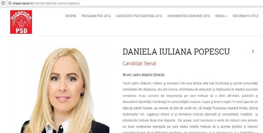În toamna lui 2016, doamna Popescu se prezenta ca fiind învăţător în Grecia şi candida pentru un fotoliu de senator. Era preocupată de „păstrarea şi dezvoltarea identităţii româneşti”.