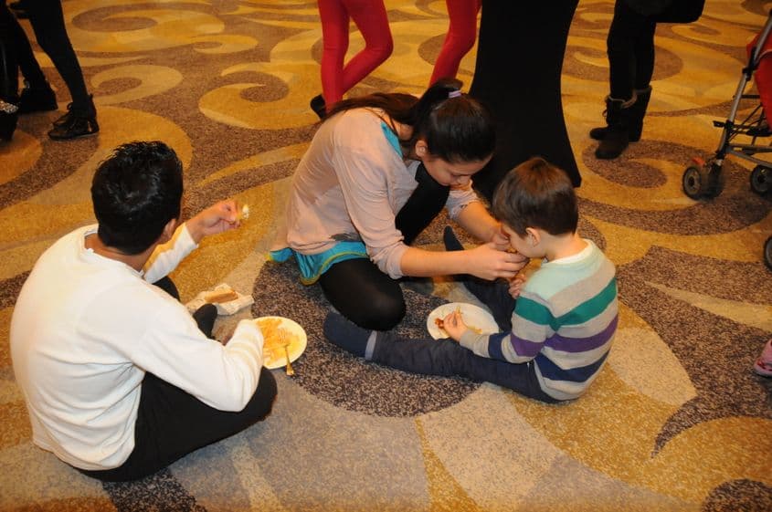 După câteva minute se întoarce și Natalia, să aibă grijă de copiii a doi dintre membrii trupei (foto). Îi liniștește cu toată răbdarea din lume, îi așază în fund pe podea și apoi le dă să mănânce, bucățică cu bucățică, să nu se înece.