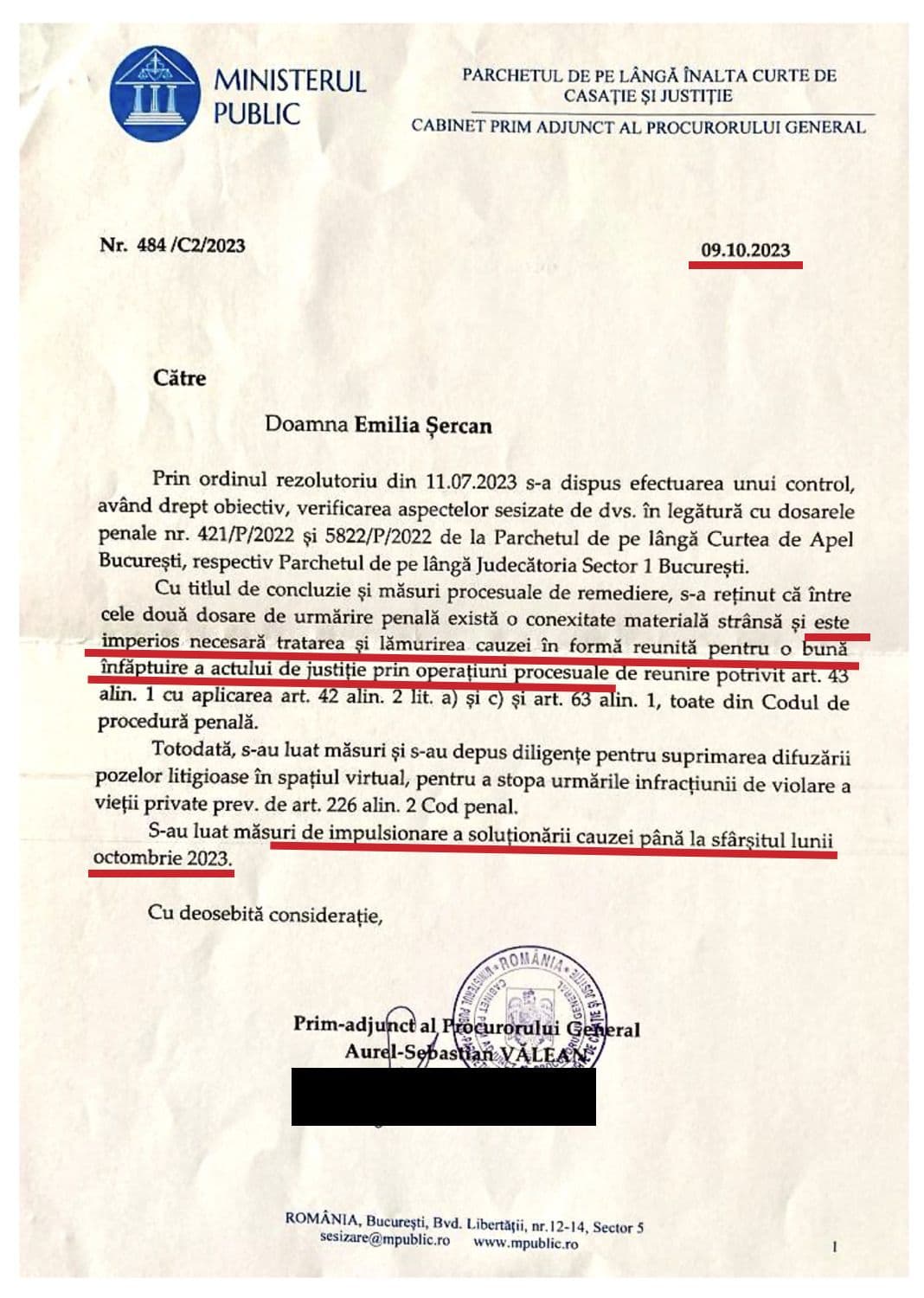 La finalul audienței din 10 octombrie, Vălean mi-a înmânat un plic închis în care se afla o adresă ce îmi era destinată și care se încheia astfel: „S-au luat măsuri de impulsionare a soluționării cauzei până la finalul lunii octombrie 2023”.