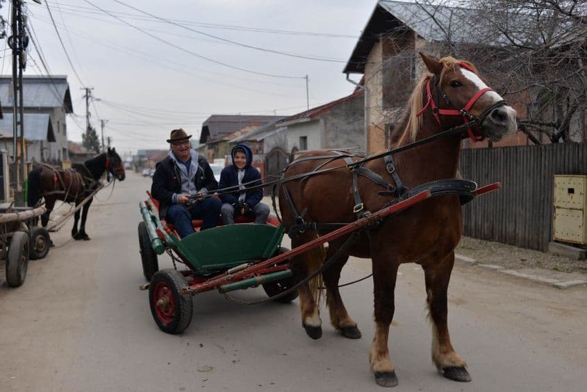 O luăm spre casa indicată și, deodată cu noi, ajunge o căruță îngrijită, vopsită în verde și roșu. E trasă de cea mai solidă iapă pe care am văzut-o vreodată.