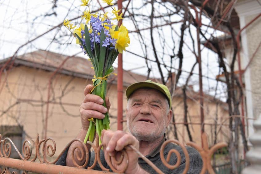Pe una dintre străduțe, un bunic de vreo 70 de ani își strânge recolta de flori. Are narcise galbene și zambile mov. Lungim capul peste gard să-l întrebăm dacă sărbătorește Paștile Cailor.