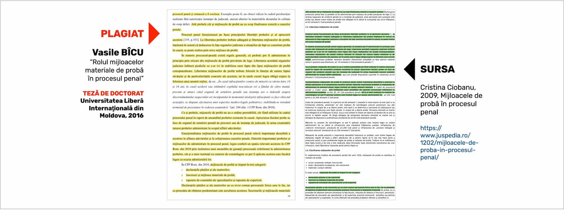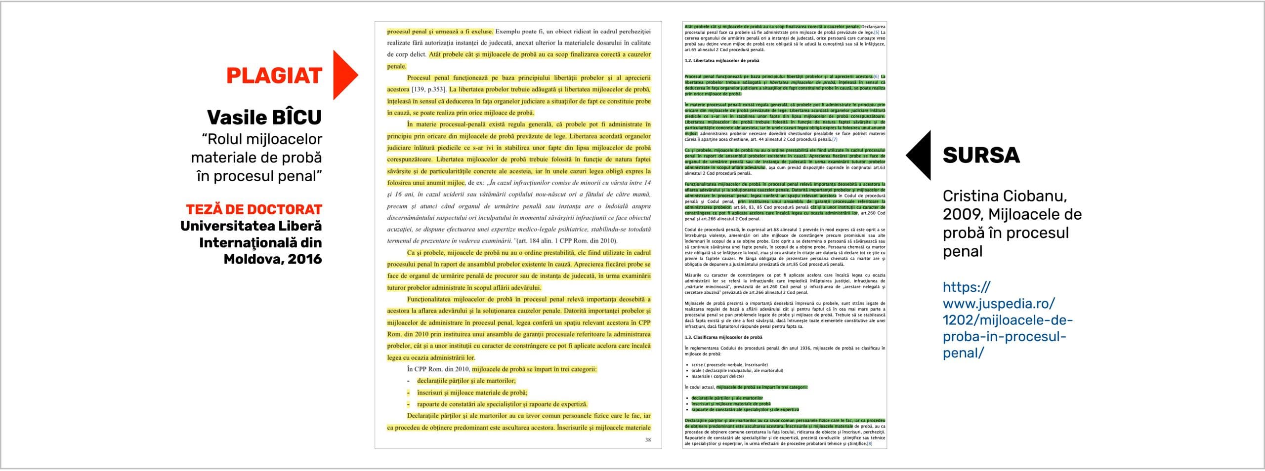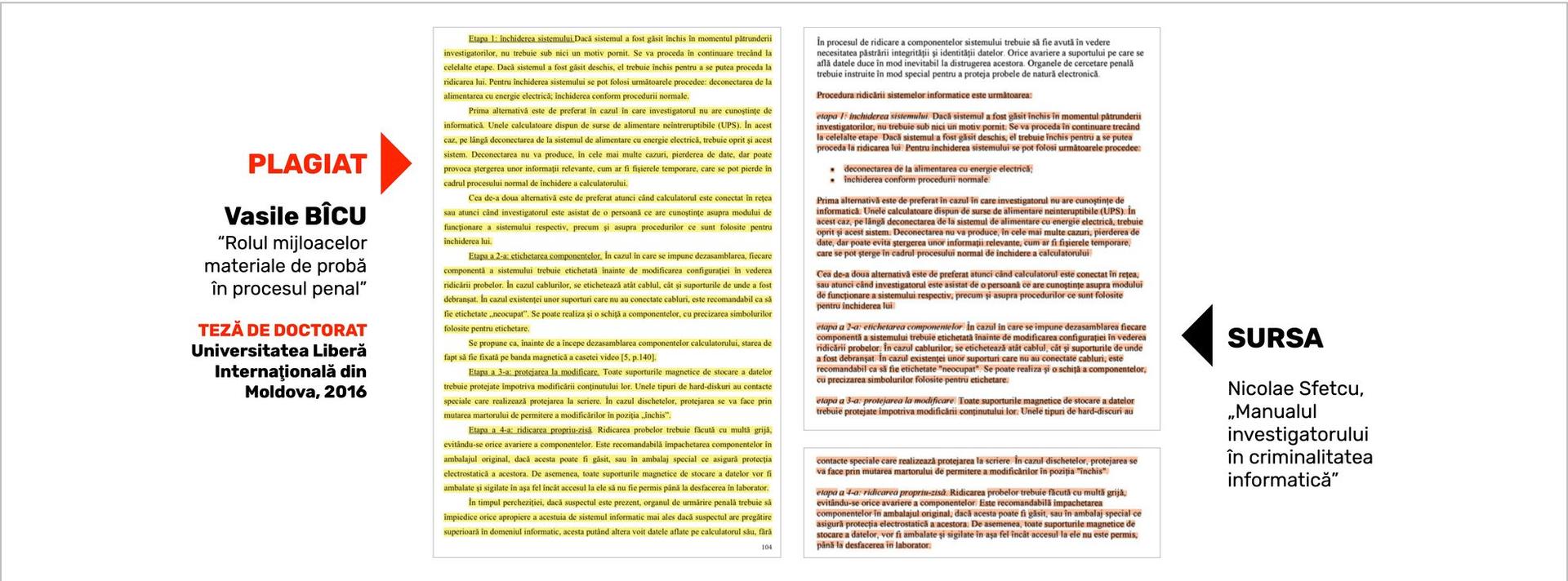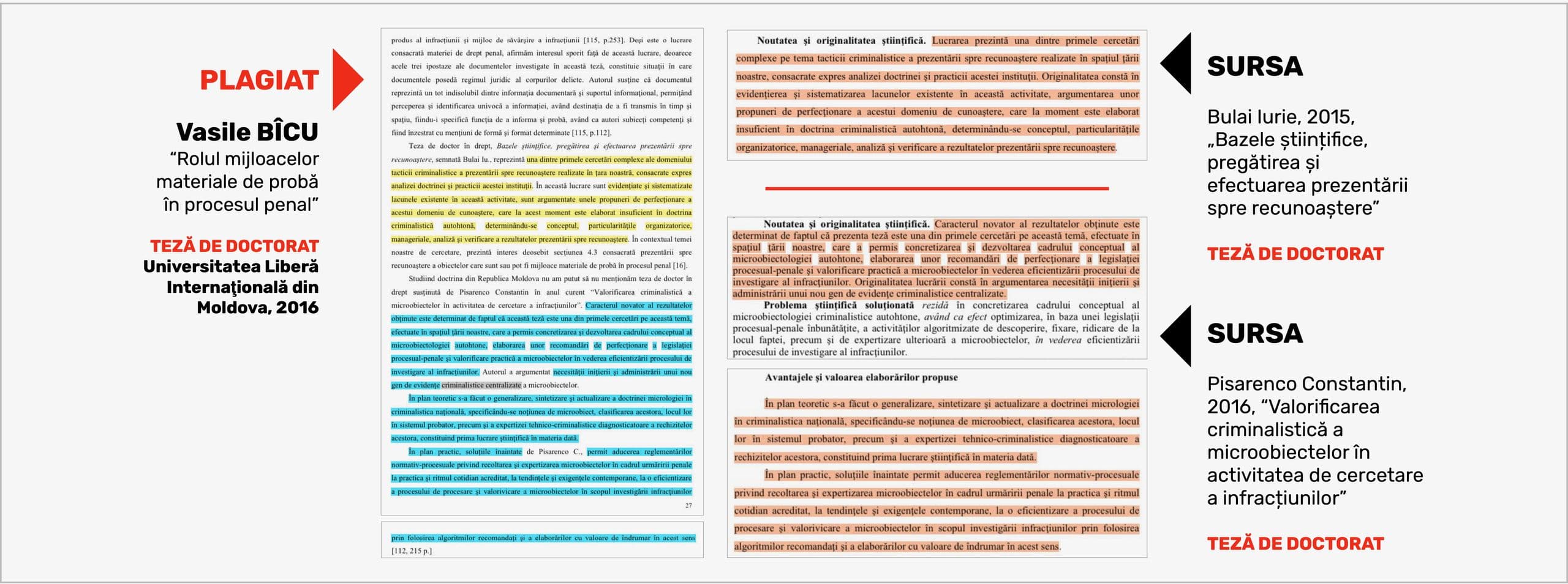 - Dincolo de procentul indicat de soft am reușit să certific, prin analiza calitativă a surselor accesibile online, că în cel puțin 23 de pagini – 14,37% din teza lui Bîcu – este vorba de conținut plagiat, nu doar de similitudini;