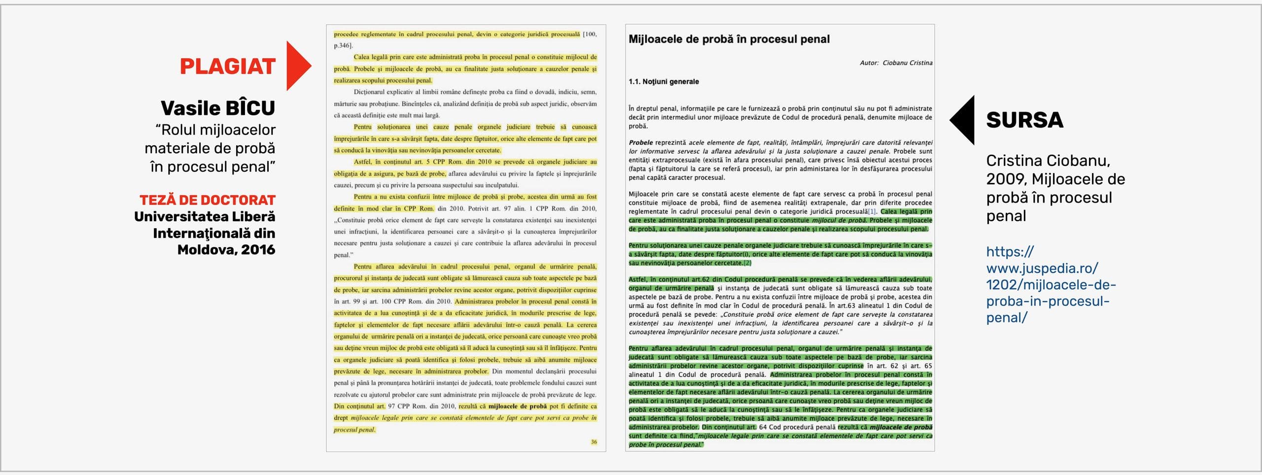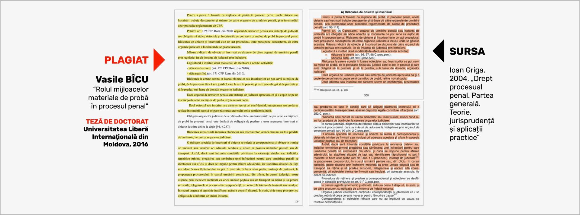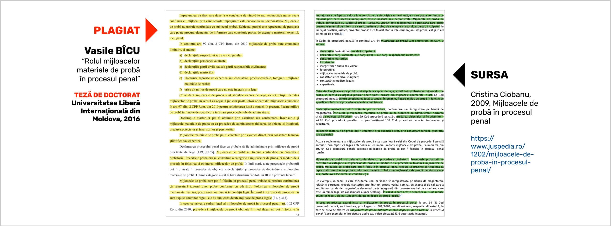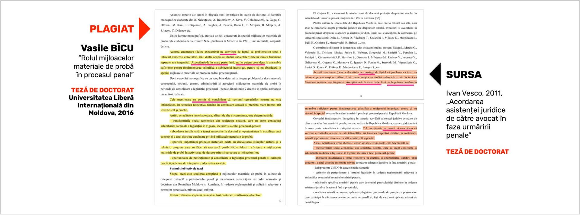 - Dincolo de procentul indicat de soft am reușit să certific, prin analiza calitativă a surselor accesibile online, că în cel puțin 23 de pagini – 14,37% din teza lui Bîcu – este vorba de conținut plagiat, nu doar de similitudini;