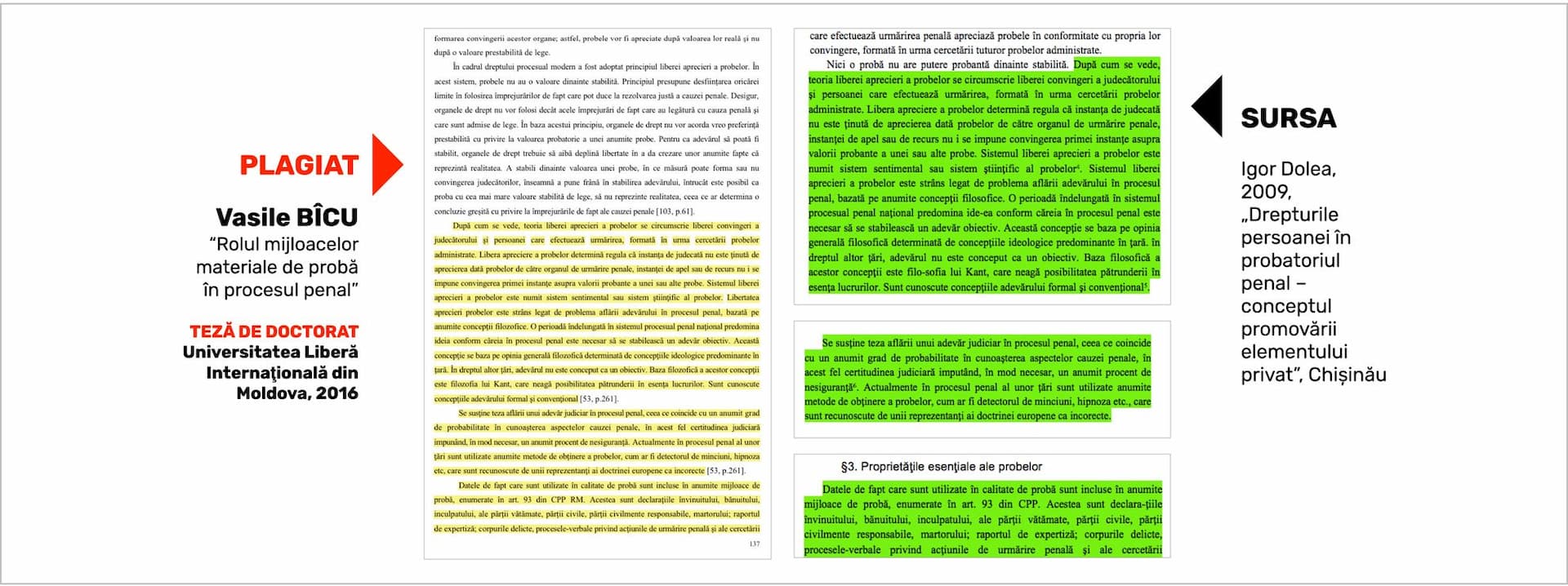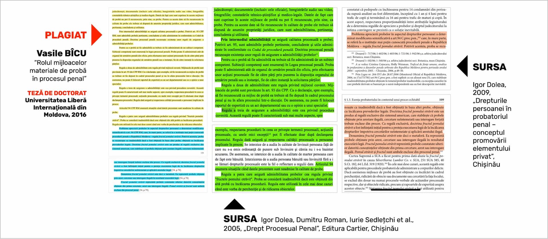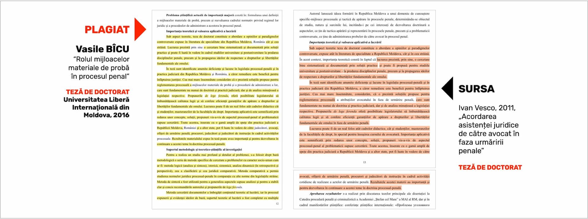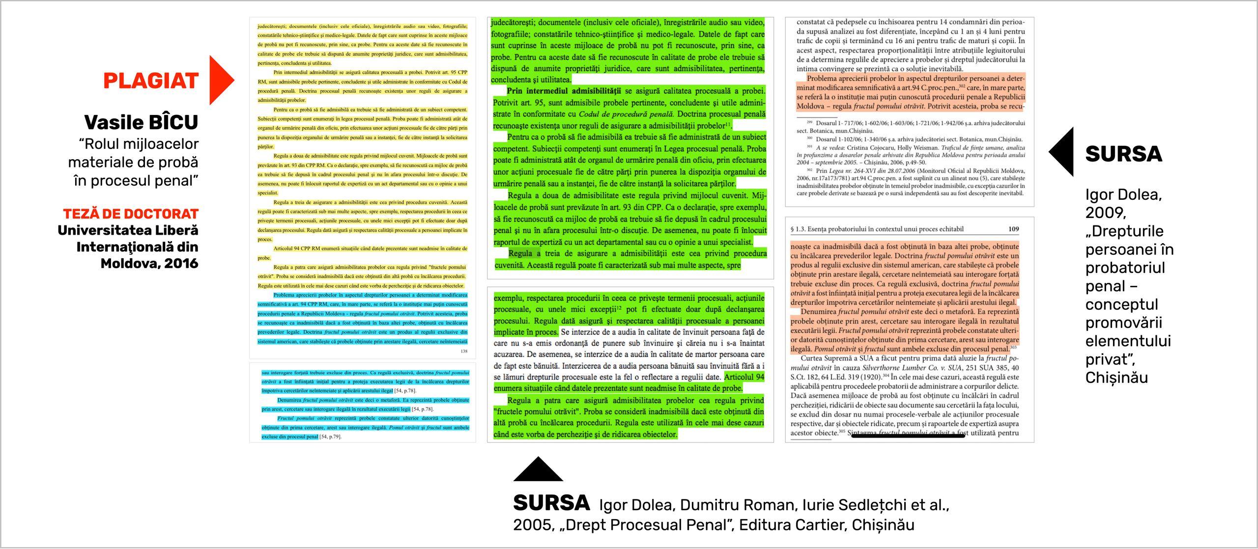 - Dincolo de procentul indicat de soft am reușit să certific, prin analiza calitativă a surselor accesibile online, că în cel puțin 23 de pagini – 14,37% din teza lui Bîcu – este vorba de conținut plagiat, nu doar de similitudini;
