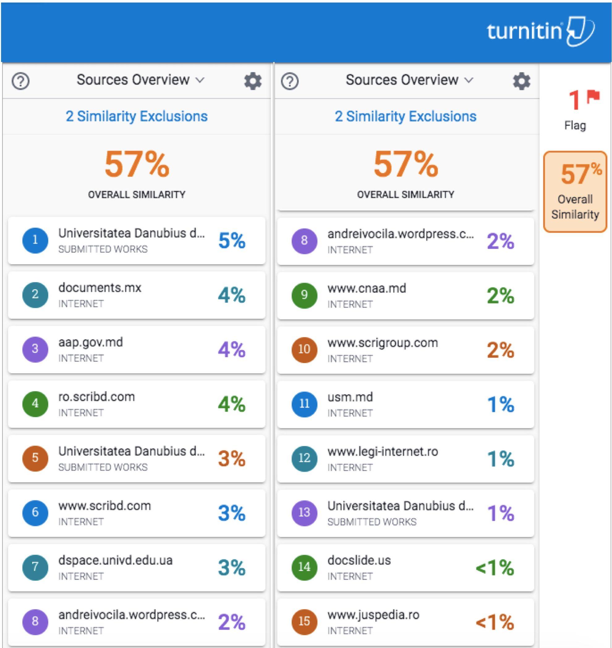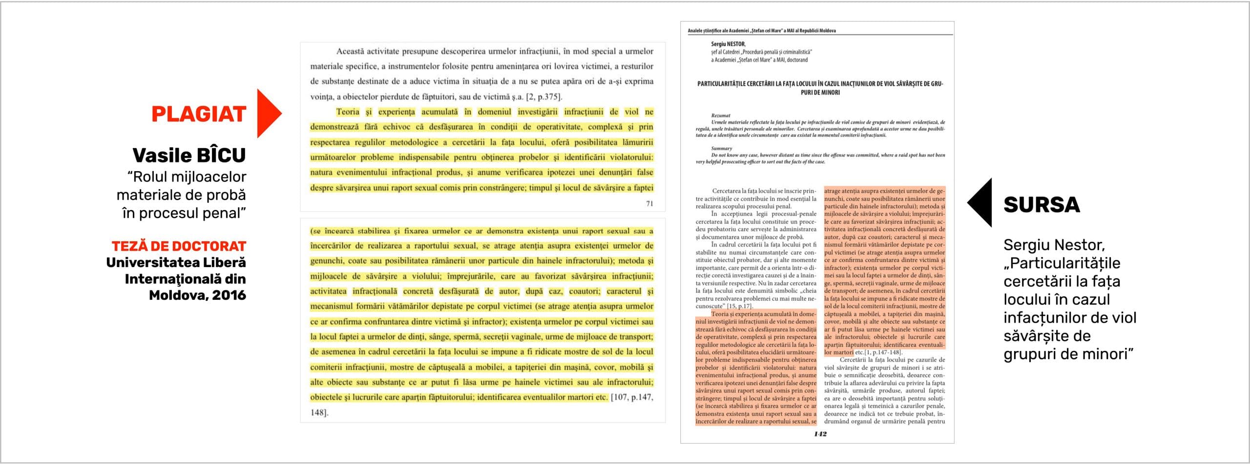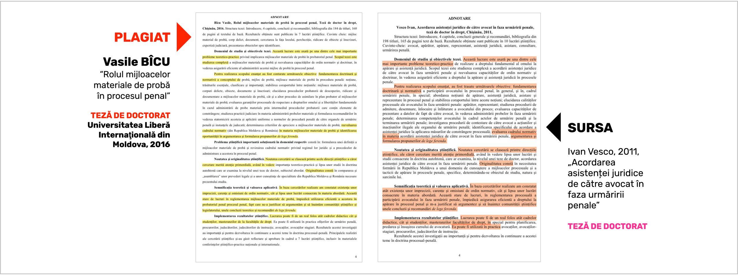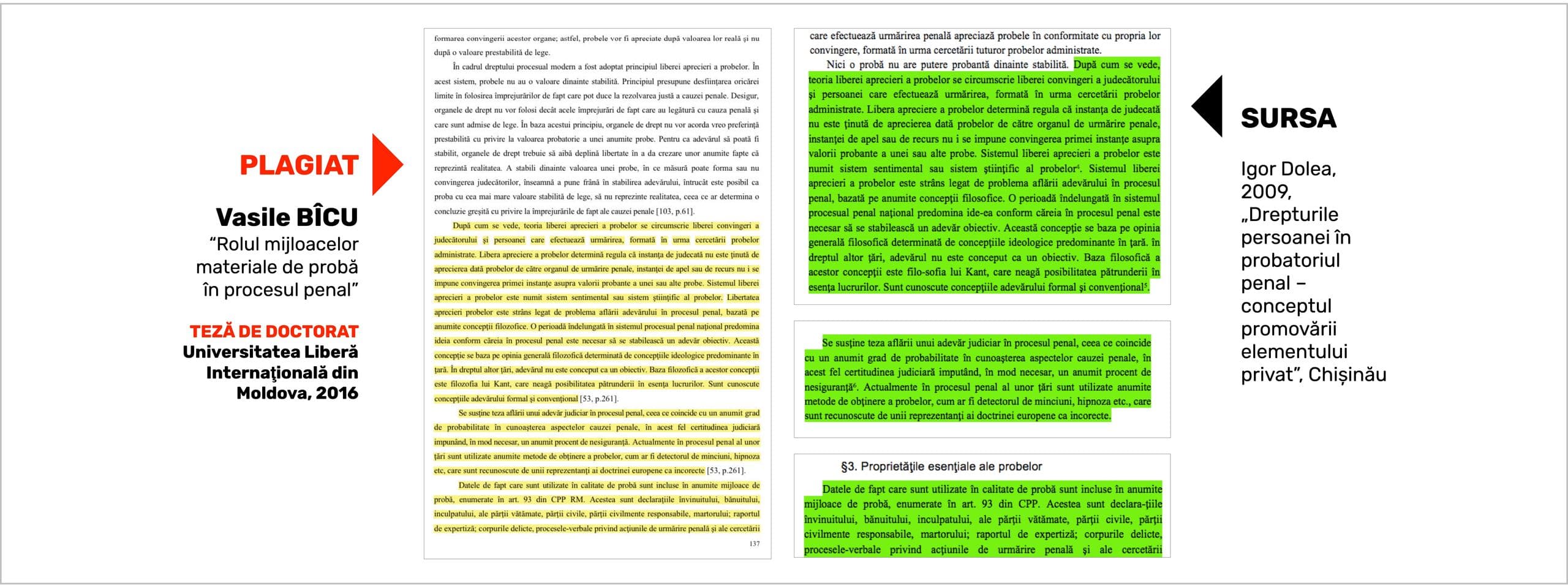 - Dincolo de procentul indicat de soft am reușit să certific, prin analiza calitativă a surselor accesibile online, că în cel puțin 23 de pagini – 14,37% din teza lui Bîcu – este vorba de conținut plagiat, nu doar de similitudini;
