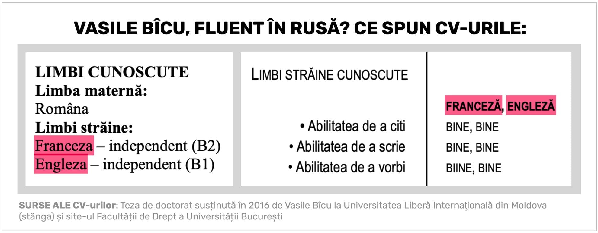 Problema este că Vasile Bîcu, în două dintre CV-urile sale, menționează că este doar utilizator independent de limba engleză și de limba franceză și nu face nicio referire la limba rusă, pe care ar fi trebuit să o stăpânească extrem de bine pentru a citi, înțelege, iar mai apoi pentru a traduce și adapta în limba română porțiunile din lucrările de specialitate citate în bibliografie.