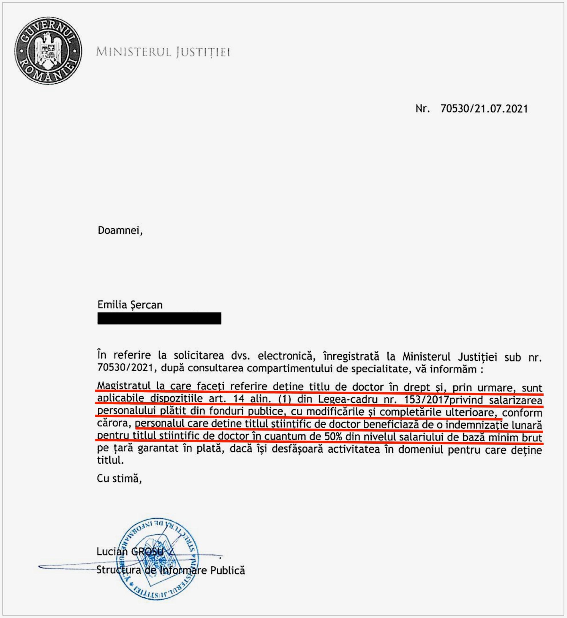 Potrivit unui răspuns oficial primit de la Ministerul Justiției din România, judecătorul Vasile Bîcu primește sporul doctoral lunar acordat de legea românească, în cuantum de 950 de lei, pentru că deține titlul de doctor în drept.