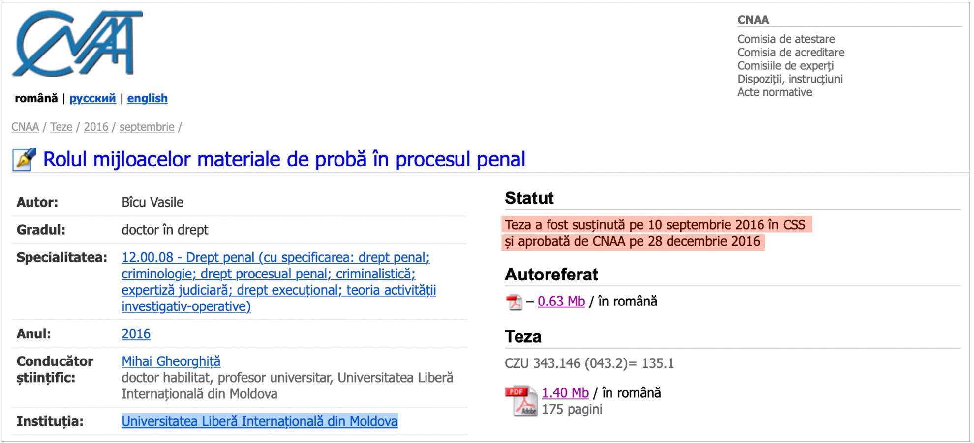 Observație: această formulă pare a fi obligatorie pentru toate tezele de doctorat în Drept din Republica Moldova.