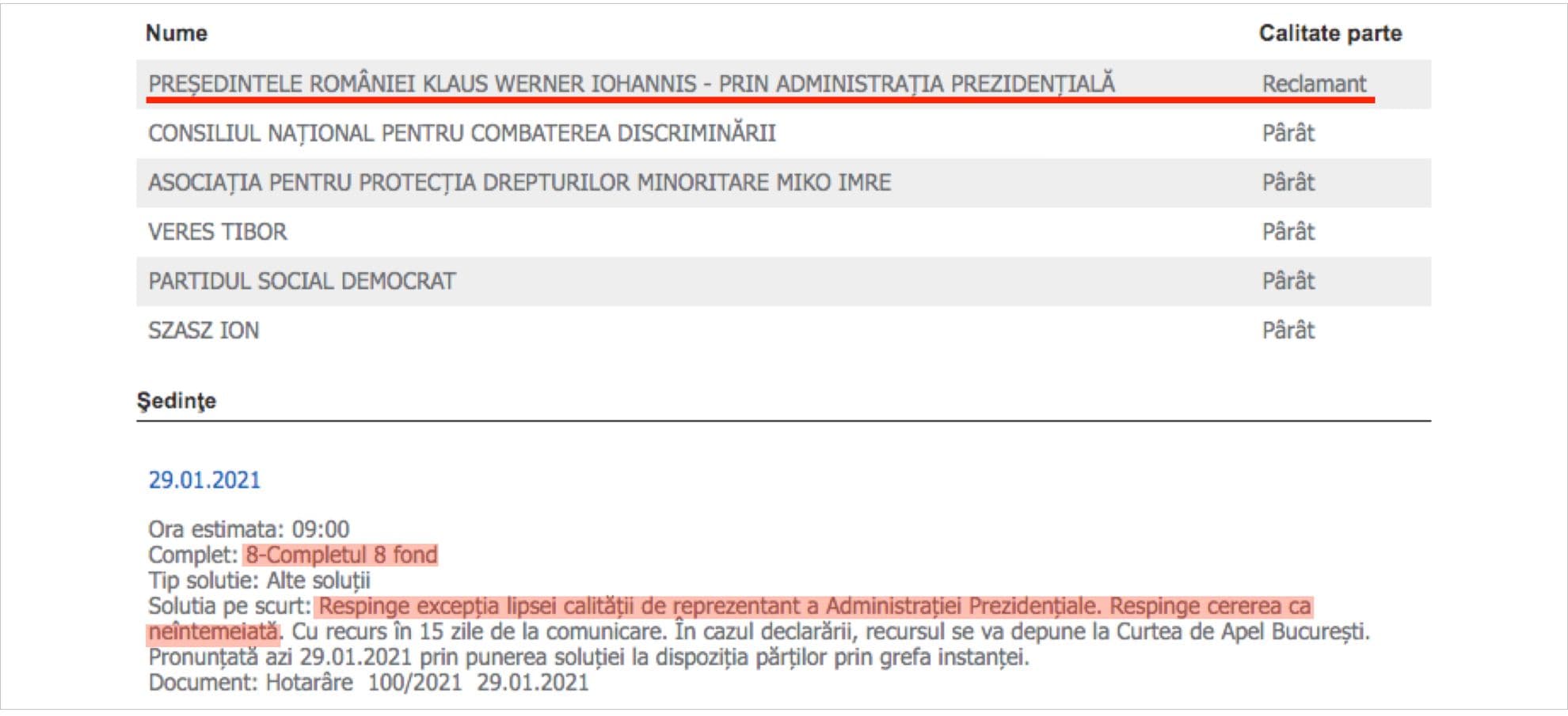 Potrivit portalului instanțelor de judecată, acțiunea a fost depusă la CAB pe data de 12 mai 2021 la ora 13:00, însă dosarul a fost distribuit aleatoriu abia a doua zi, pe 13 mai. Procedura de repartizare a dosarelor, pentru a elimina orice suspiciune de ingerință, prevede atribuirea lor unui complet de judecată imediat ce acestea ajung la instanță.
