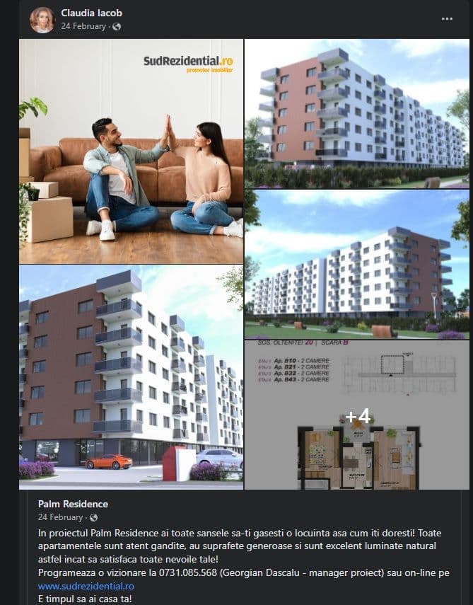Una dintre acestea este Joya Shoes Concept SRL, care până în 2018, când și-a schimbat obiectul principal de activitate în „lucrări de construcție a clădirilor rezidențiale și nerezidențiale”, se ocupa cu fabricarea de încălțăminte. Un al doilea exemplu este Palm Residence Deluxe SRL, unde aceeași Claudia Iacob deține jumătate din acțiuni. Firma construiește la ora actuală complexul Palm Residence Olteniței, un ansamblu de blocuri în regim P+5E care-și propune să adăpostească cel puțin 119 familii din decembrie 2022 încolo.