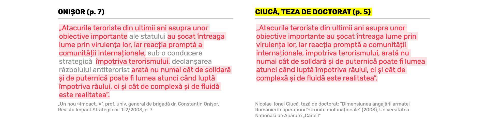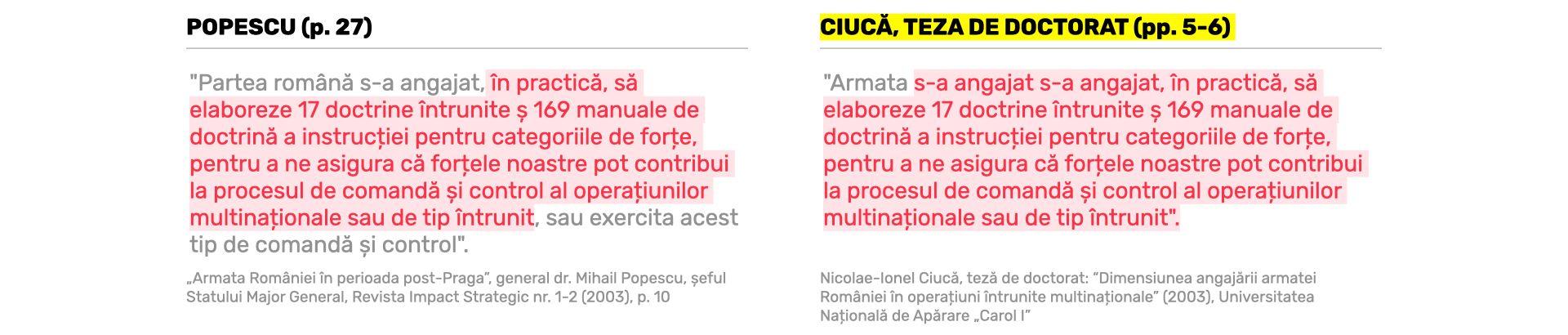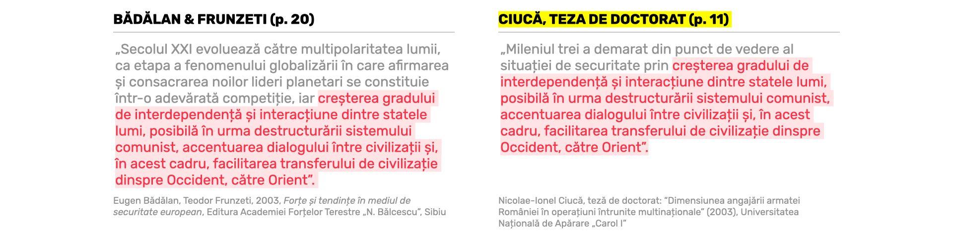 În șapte pagini din teza de doctorat a premierului Ciucă am descoperit conținut plagiat din teza lui Duță. Textele sunt preluate fidel, însă fără citare corespunzătoare și fără ghilimele, fiind copiate inclusiv notele de subsol din lucrarea lui Duță.