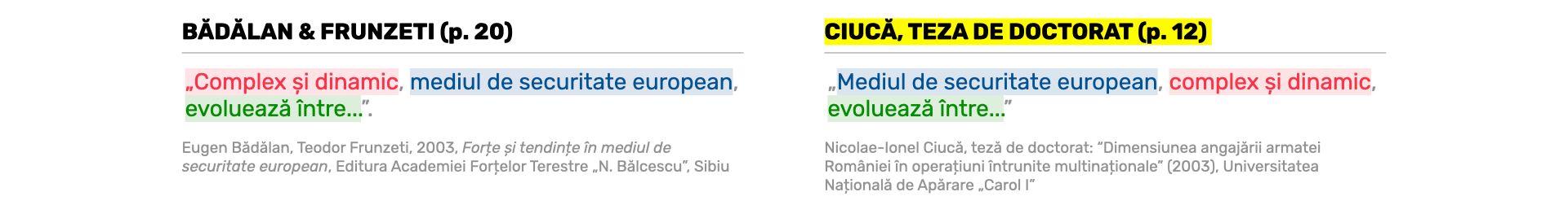 Nicolae Ciucă preia, fără citare, pagini întregi din volumul Forțe și tendințe în mediul de securitate european, semnat de Eugen Bădălan - unul dintre predecesorii lui Ciucă la șefia Statului Major al Armatei - și de Teodor Frunzeti, fost consilier pe probleme de apărare la Administrația Prezidențială în primul mandat al președintelui Iohannis.