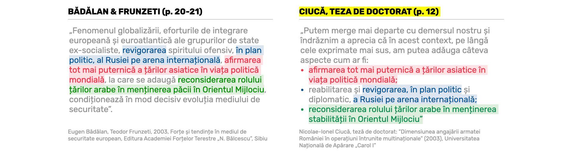 În exemplul de mai jos, „Secolul XXI evoluează către...” din cartea lui Bădălan & Frunzeti a devenit în teza lui Ciucă „Mileniul trei a demarat...”. După această reformulare urmează o înșiruire de 31 de cuvinte identice.