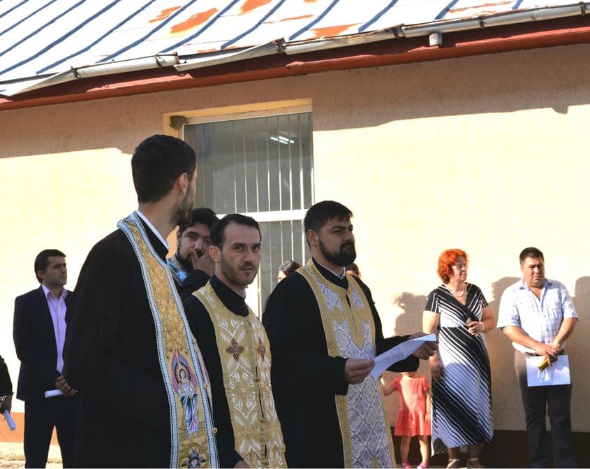 În spatele celor patru preoți veniți să oficieze o slujbă pentru începutul de an școlar, profesorii școlii din Petrăchioaia stau aliniați. Unii zâmbesc, pe alții nu îi părăsește încruntarea. Directorul, stresat, se plimbă de la unul la altul și salută.