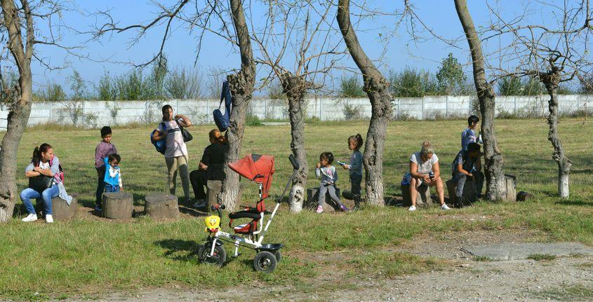 Se strigă nume de copii: „Dani! Mario! Acasă!”.