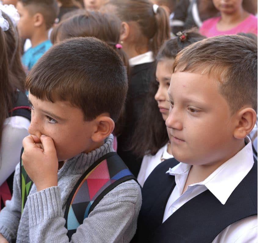 Sute de fete și de băieți se înghesuie în curtea Școlii Gimnaziale din comuna Petrăchioaia. E o mulțime de șorțuri albastre cu gulere albe şi de cămăși bărbătești în miniatură, vegheate de părinți stresați, mămăițe cu maramă și, dincolo de catedre, pedagogi.