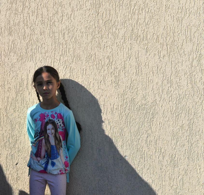 O fetiță cu ochelari și funde în cozi ascultă slujba, încruntată. Se închină cu cele trei degete împreunate geometric, de parcă ar picta un crucifix în aer.