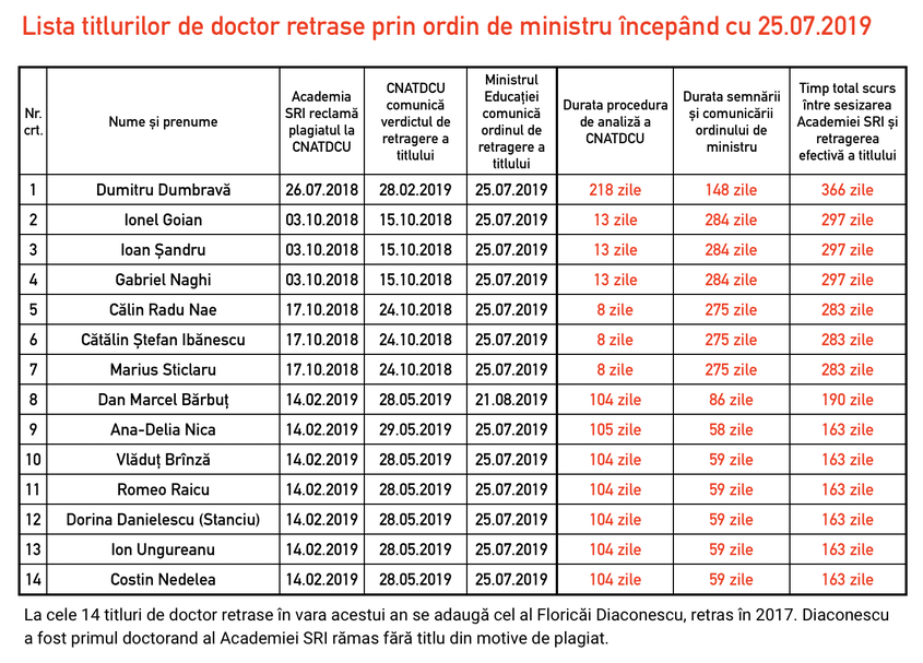 Deciziile de retragere a titlurilor pentru cei 14 doctori ai Academie SRI au fost emise de CNATDCU între august 2018 și mai 2019.