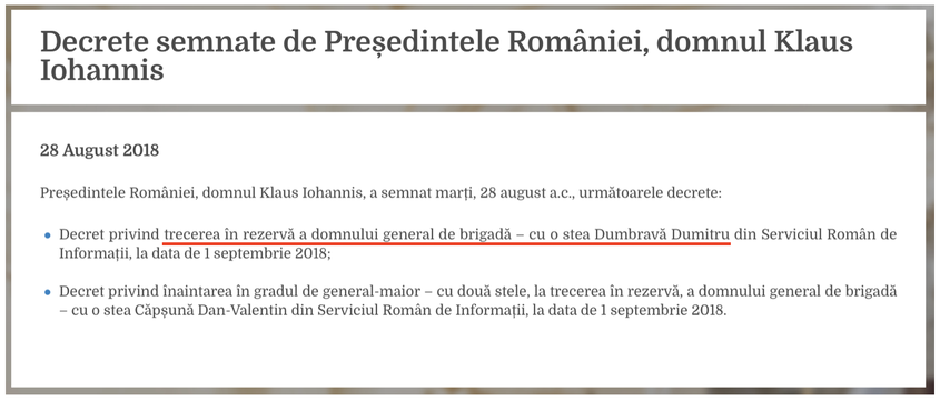 Decretul de trecere în rezervă semnat de președintele Klaus Iohannis sugerează că plecarea generalului Dumbravă din SRI a fost una forțată. El nu a fost înaintat în grad și apoi trecut în rezervă, așa cum se obișnuiește cu militarii de carieră, mai ales cu cei ajunși la vârful structurilor de forță, ci a fost pensionat cu gradul de la acel moment.