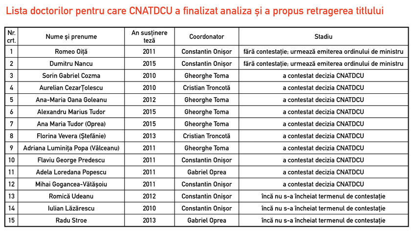 Cei 14 doctori rămași fără titlul de doctor, care ar urma să ajungă în fața instanței de judecată pentru anularea diplomei, fac parte din lista de 41 de doctori ale căror teze au fost raportate drept plagiate la CNATDCU chiar de Academia SRI începând cu toamna anului trecut.