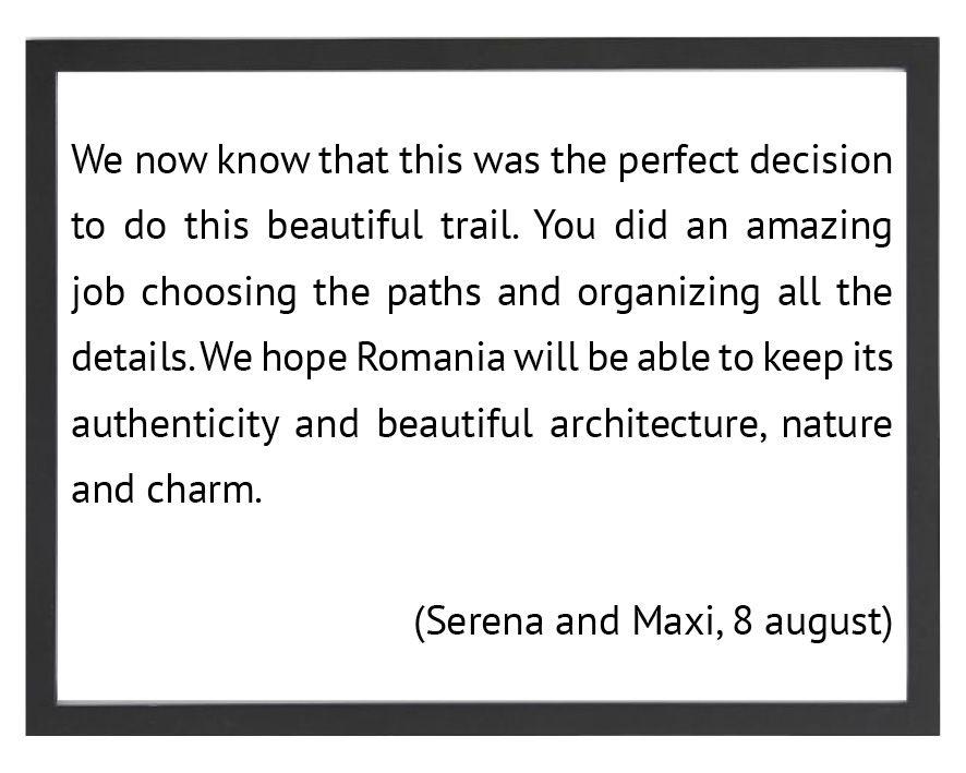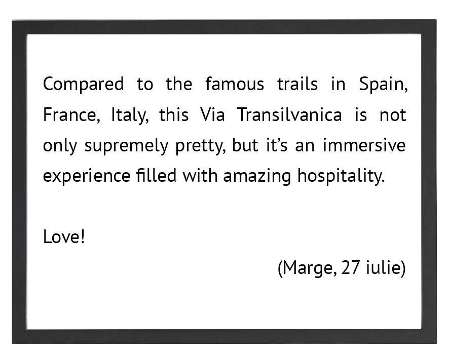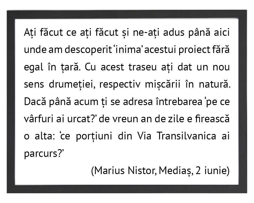 Suntem conștienți de forța, dar și de fragilitatea proiectului nostru. Via Transilvanica este departe de a fi un panaceu menit să rezolve problemele de fond ale României. Dar eu resimt dragostea și atașamentul oamenilor pentru acest proiect. Sper că dragostea va învinge, așa cum spun toate cărțile bune.
