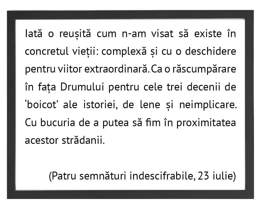 În Geneza actul de creație al fiecărei zile se termină cu concluzia succintă și repetitivă a Creatorului: a văzut că toate erau bune. Păstrând comparația într-o notă de smerenie și umor, pot spune că mie nu chiar toate mi s-au părut bune, dar le-am văzut perfectibile. Însă cutia strâmtă a priceperii mele cu privire la lume și lucruri s-a deschis și mi-a revelat ceva ce nu știam despre mine însumi. Iar acel Dumnezeu abstract și nevăzut al Vechiului Testament a căpătat o formă inteligibilă, o realitate care m-a însoțit pe toți cei 1.400 de kilometri făcuți de la Putna până la Dunăre.