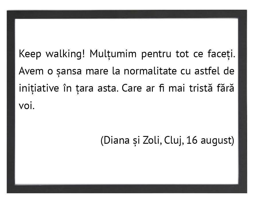 Am coborât în lume, printr-o mare mulțime de oameni, purtând cu mine, invizibilă, toată energia drumului. Am avut parte de multe revelații. Poate cea mai importantă a fost dezvăluirea unei lumi coerente, închegate, pe care nu o bănuisem. Una e să faci traseul pe bucăți și mai rapid, iar cu totul alta e să îl parcurgi atent, participativ, la foc mic. A fost o experiență revelatoare și vindecătoare.