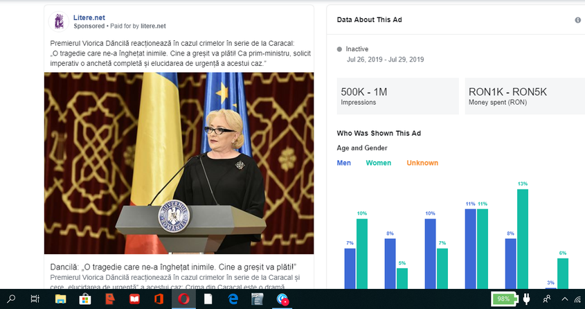 Potrivit datelor publicate de Facebook în librăria de anunțuri sponsorizate a paginii, articolul a fost afișat între 500.000 și 1.000.000 de ori.