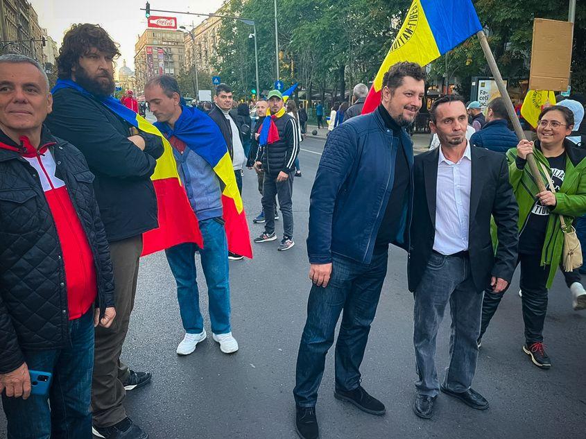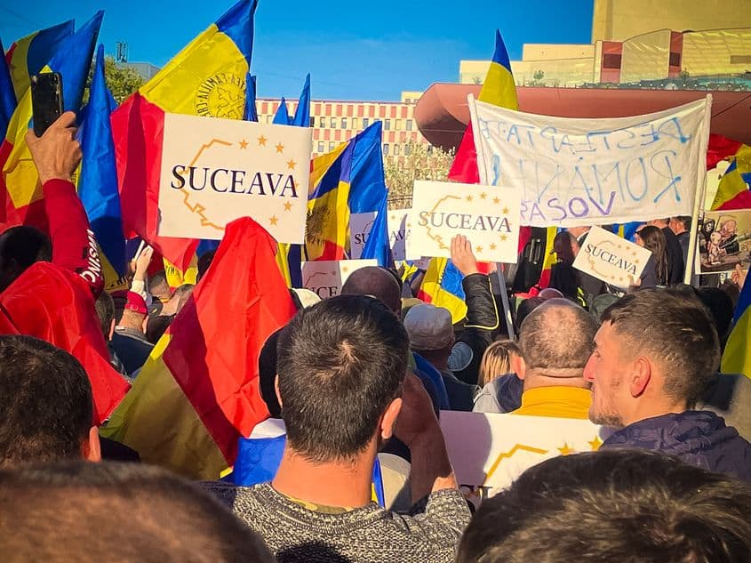 "De unde ești?" îl întreb pe un protestatar care ține un carton cu „Suceava” în mână. „Broșteni, județul Suceava”, răspunde. E într-un grup de șase. A venit cu autocarul, de dimineață. "De ce ai venit?" mai întreb. „Soră-mea e șefă de filială la AUR”, mă lămurește.
