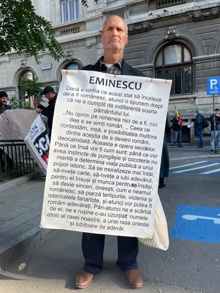 Mesajul e rapid și robotic preluat de mulțime, inclusiv de un domn care merge comic, ca într-un film mut, din cauza unei pancarte uriașe în care e îmbrăcat și pe care e citat marele nostru poet național, Mihai Eminescu.