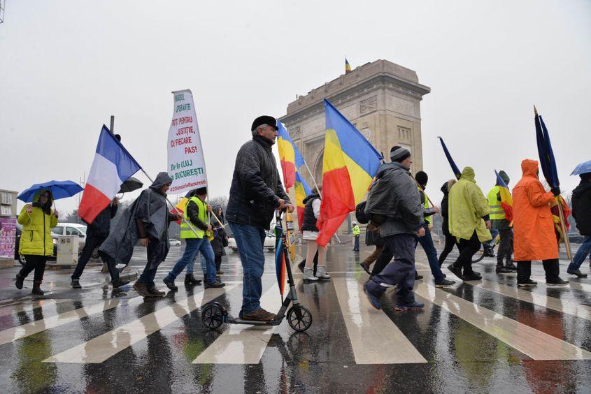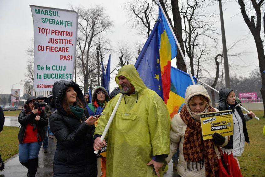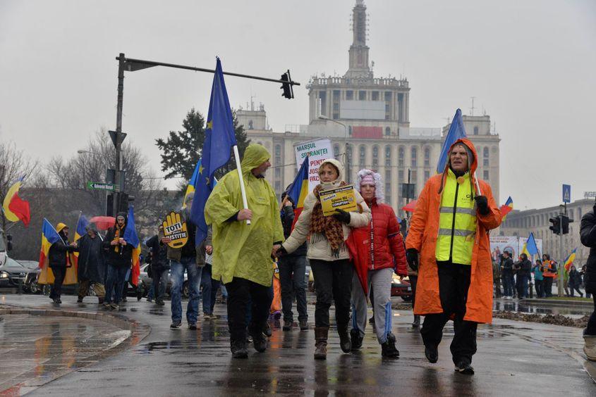 „Știți ce e ciudat? După 28 de ani, strigăm aceleași sloganuri ca în ’90. Am ajuns să strigăm «Jos comunismul!» și «Dreptate!»”, spune Sorin, în timp ce înaintează prin ploaie, acoperit cu o pelerină galbenă și purtând steagul Uniunii Europene pe umăr.