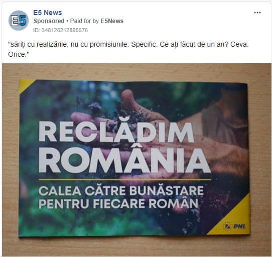 Mai târziu, din 4 iunie, 2020, pagina începe să plătească publicitate electorală pe Facebook. Banii pe care îi investește pagina sunt pentru a promova materiale negative despre PNL în județe precum Iași, Suceava, Neamț, Botoșani, Vaslui. În mai puțin de 3 luni, E5News a plătit, în total, 37.342 de lei pe publicitate politică.