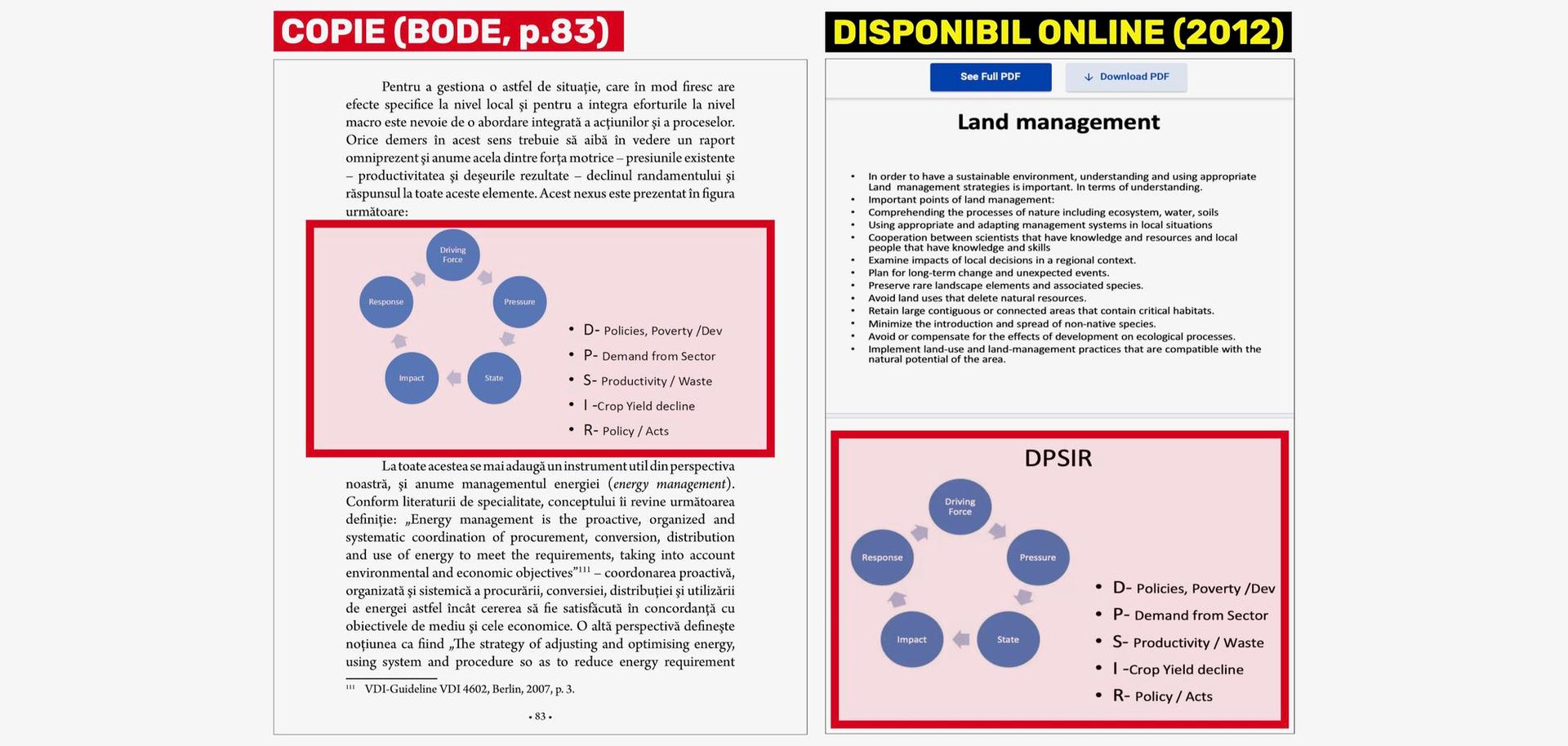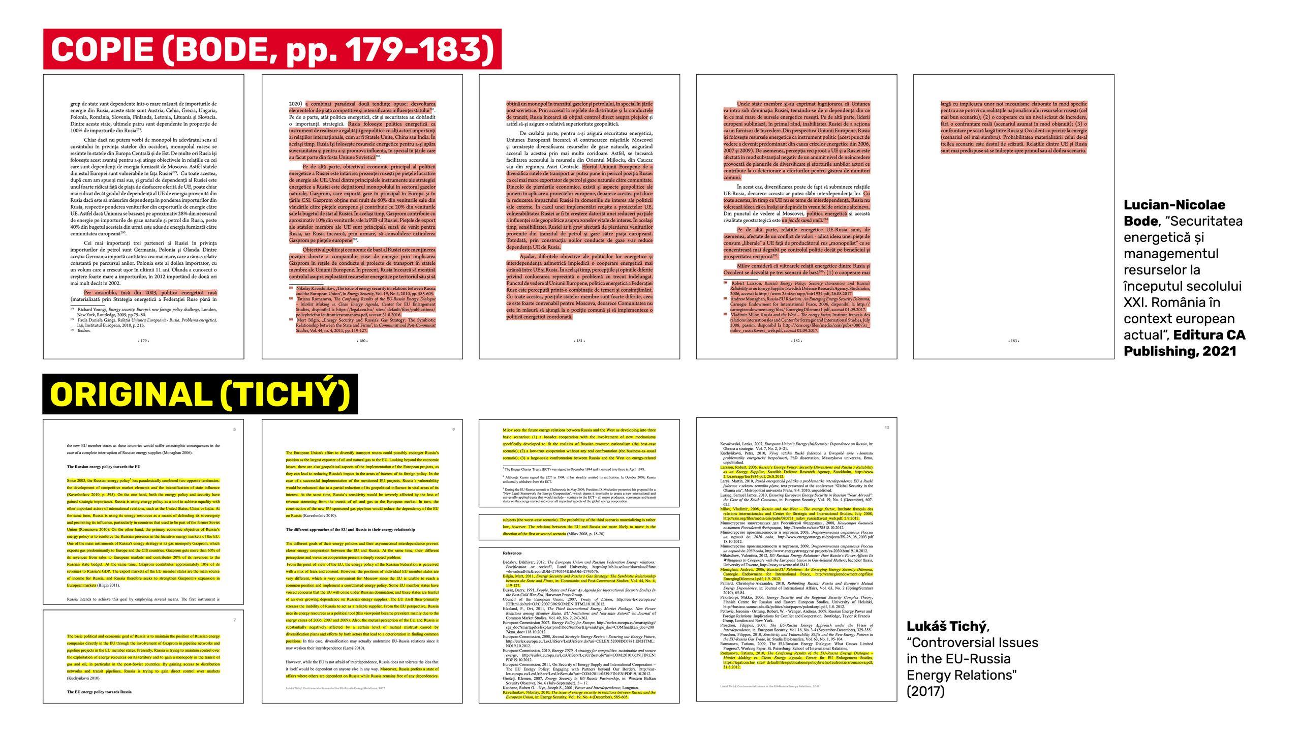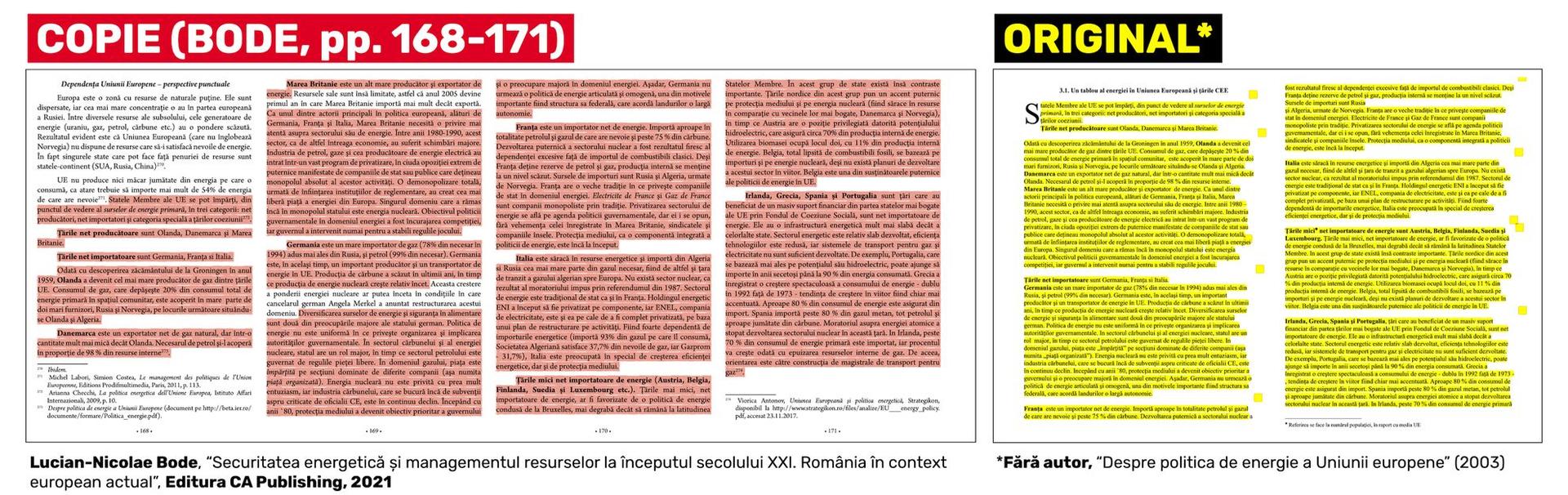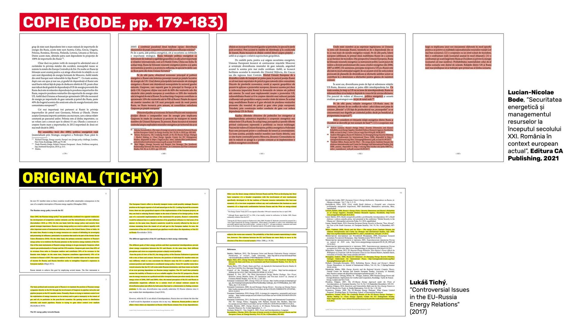 - Bode a plagiat, de facto, nu 18 rânduri, ci 109 rânduri - un calup compact de 3 pagini și jumătate, însumând 1.100 de cuvinte, de la pagina 168 la pagina 171 - din lucrarea “Despre politica de energie a Uniunii Europene”, realizată în 2003 în cadrul proiectului Phare RO 0006.18.02.