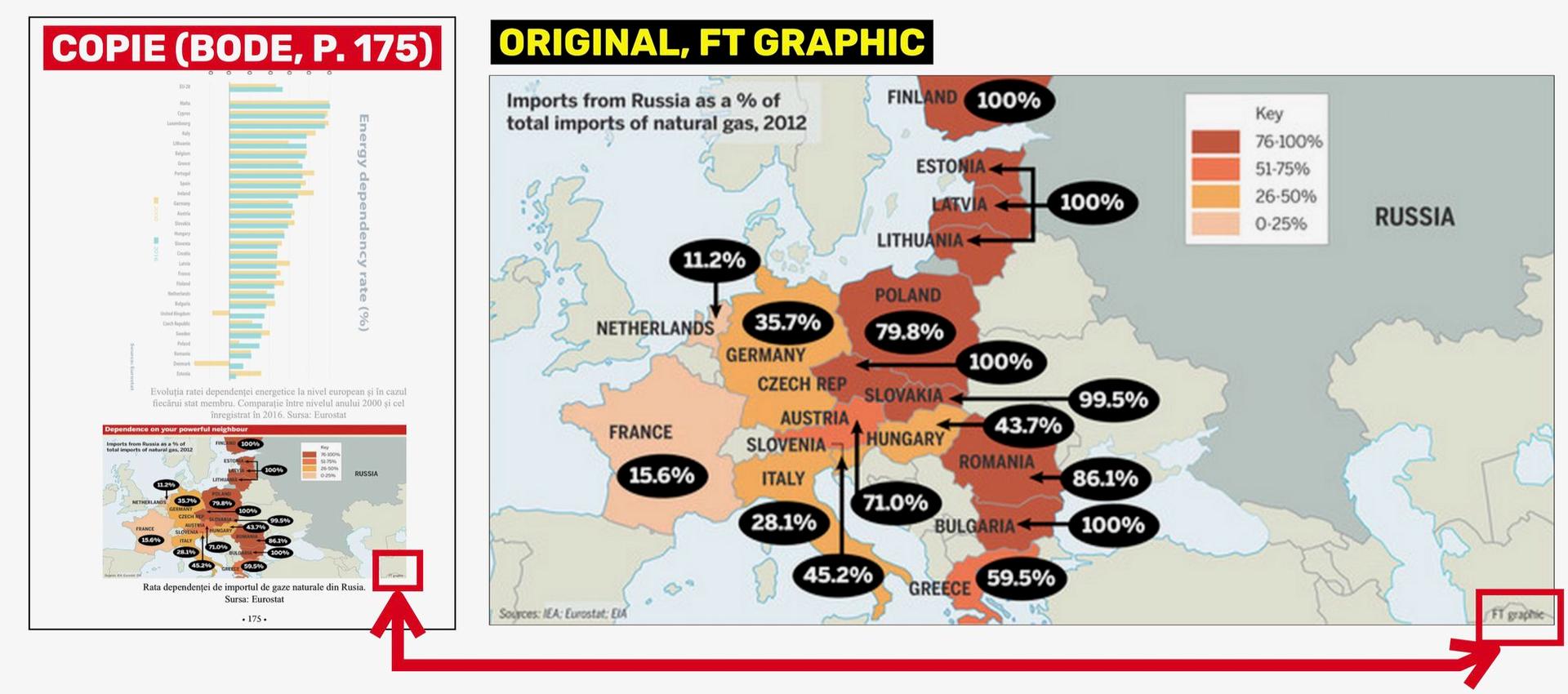Un exemplu relevant: CNE concluzionează că imaginea de la pagina 175 este citată corect Eurostat. În realitate, în colțul imaginii plagiate de Bode este vizibil adevăratul autor al hărții, publicația Financial Times, graficul fiind realizat în baza datelor colectate din trei surse: International Energy Agency, Eurostat și US Energy Information Administration.