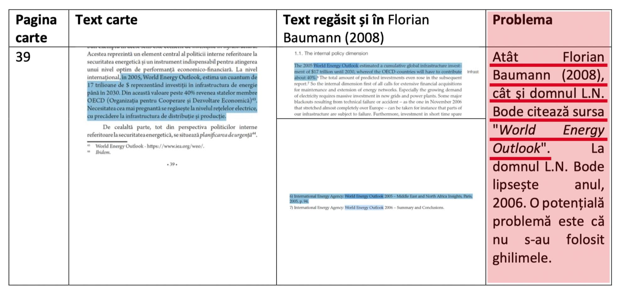 - Bode a plagiat, de facto, nu 18 rânduri, ci 109 rânduri - un calup compact de 3 pagini și jumătate, însumând 1.100 de cuvinte, de la pagina 168 la pagina 171 - din lucrarea “Despre politica de energie a Uniunii Europene”, realizată în 2003 în cadrul proiectului Phare RO 0006.18.02.
