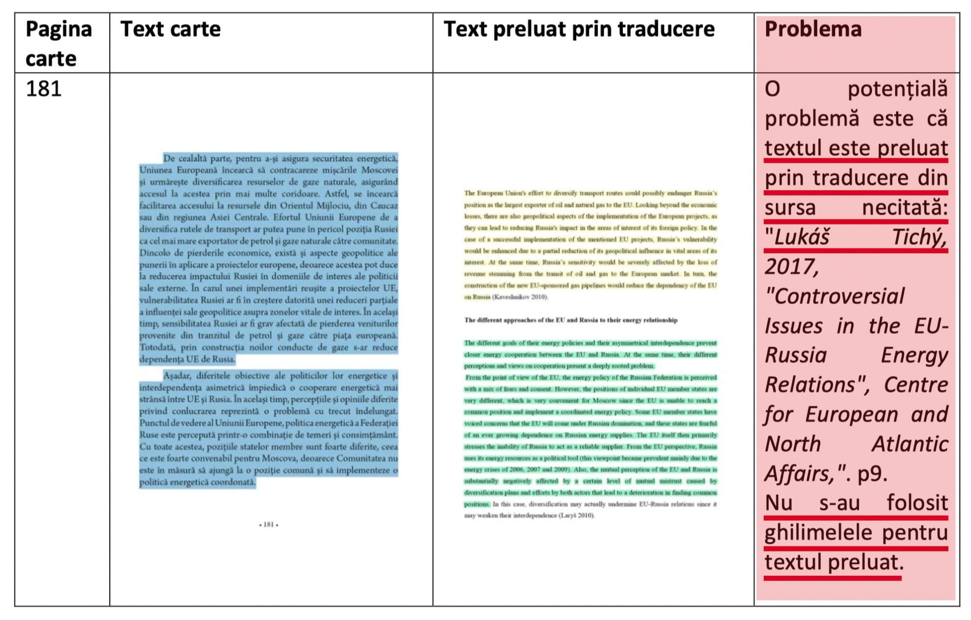 - “Există cazuri în care unele porțiuni de text au fost posibil preluate prin traducere din limba engleză, dar fără să fie citată sursa”;