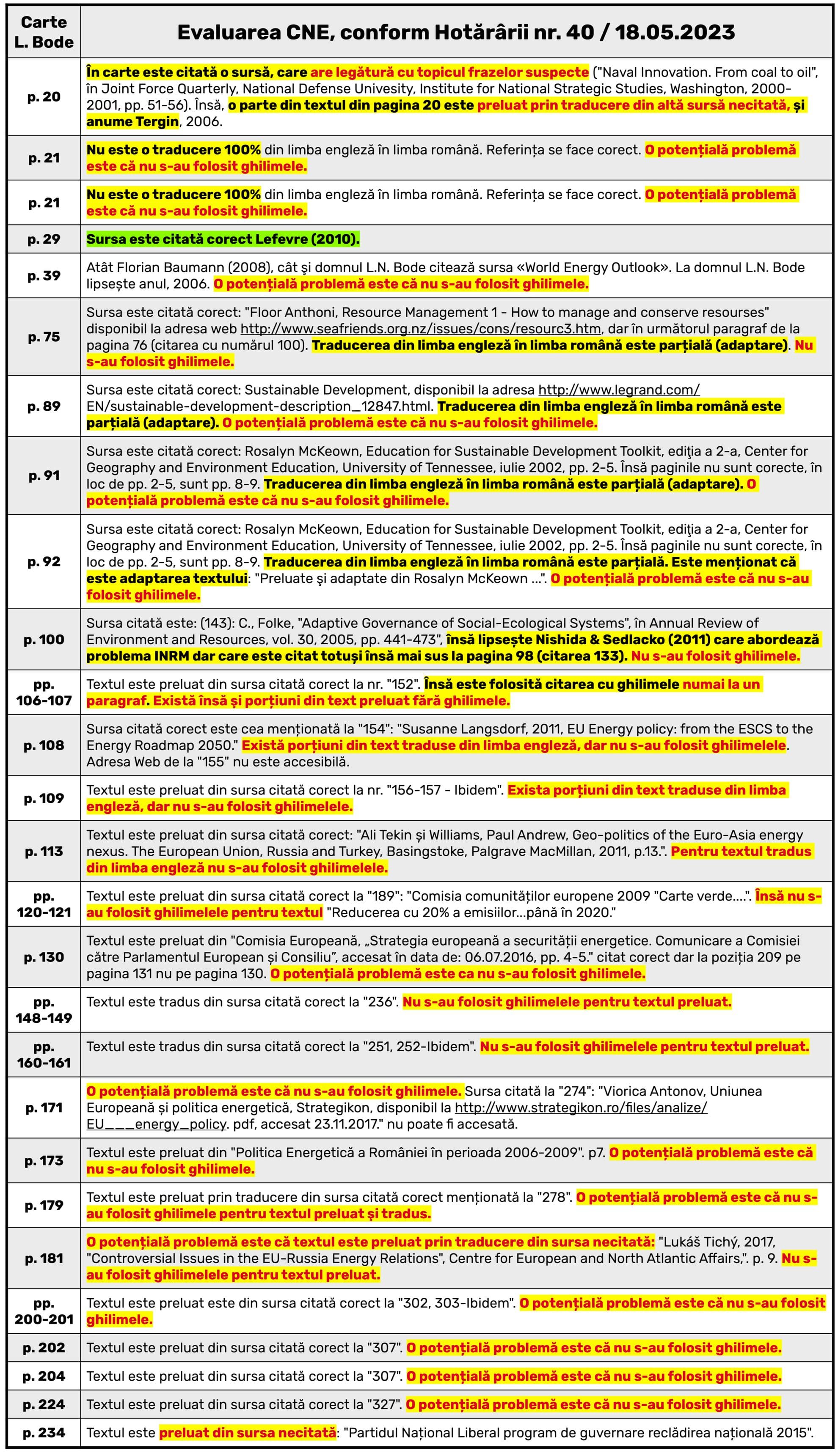 - (4) CNE a dat verdict de neplagiat în contradicție cu propriile concluzii: a constatat că Lucian Bode nu a citat deloc sau nu a marcat cu ghilimele fragmente de text copiate de la alți autori - în anumite situații, pagini întregi - însă a camuflat abaterile constatate prin formulări echivoce, relativizante (“o potențială problemă este că nu s-au folosit ghilimele”) sau prin formulări lipsite de temei logic (“[imaginea] nu a fost găsită în alte publicații, probabil că este originală”).