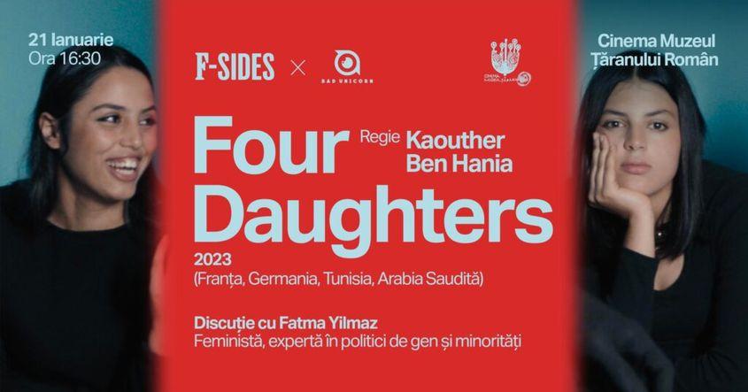 Duminică, de la 16:30, are loc proiecția documentarului proaspăt intrat în cinematografe, Four Daughters (2023). După proiecție va avea loc o discuție cu Fatma Yilmaz, feministă, expertă în politici de gen și minorități și militantă pentru drepturile femeilor musulmane.