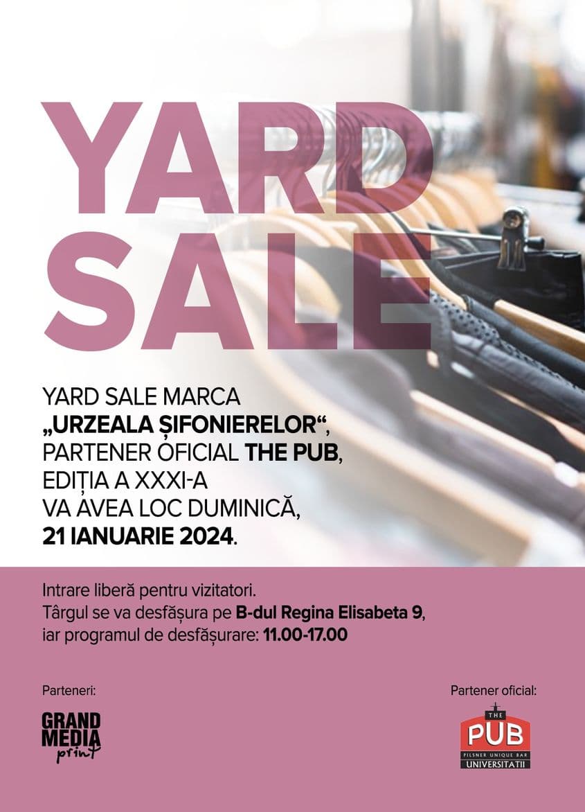 Duminică, între 11:00 și 17:00, are loc Yard Sale by Urzeala Șifonierelor la The Pub (Bulevardul Regina Elisabeta 9). Participarea pentru o zi cu stender personal este de 150 lei, iar intrarea vizitatorilor este gratuită.