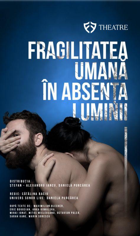 Duminică, de la 18:00, se joacă Fragilitatea umană în absența luminii, la FF Theatre (65 de lei). Piesa își propune să vorbească despre efectele resimțite în cazurile de depresie și despre parcursul intim al acestora.