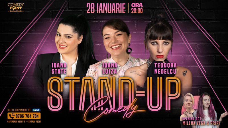 Duminică este girls night la Cafeneaua Veche, unde Ioana Luiza, Teodora Nedelcu și Ioana State spun glume de la 20:00 (40 de lei).