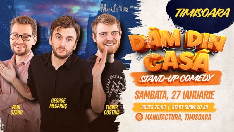 Sâmbătă, de la 20:30, George Mesaroș, Paul Szabo și Tudor Costina au show de stand-up la Manufactura (40 de lei).