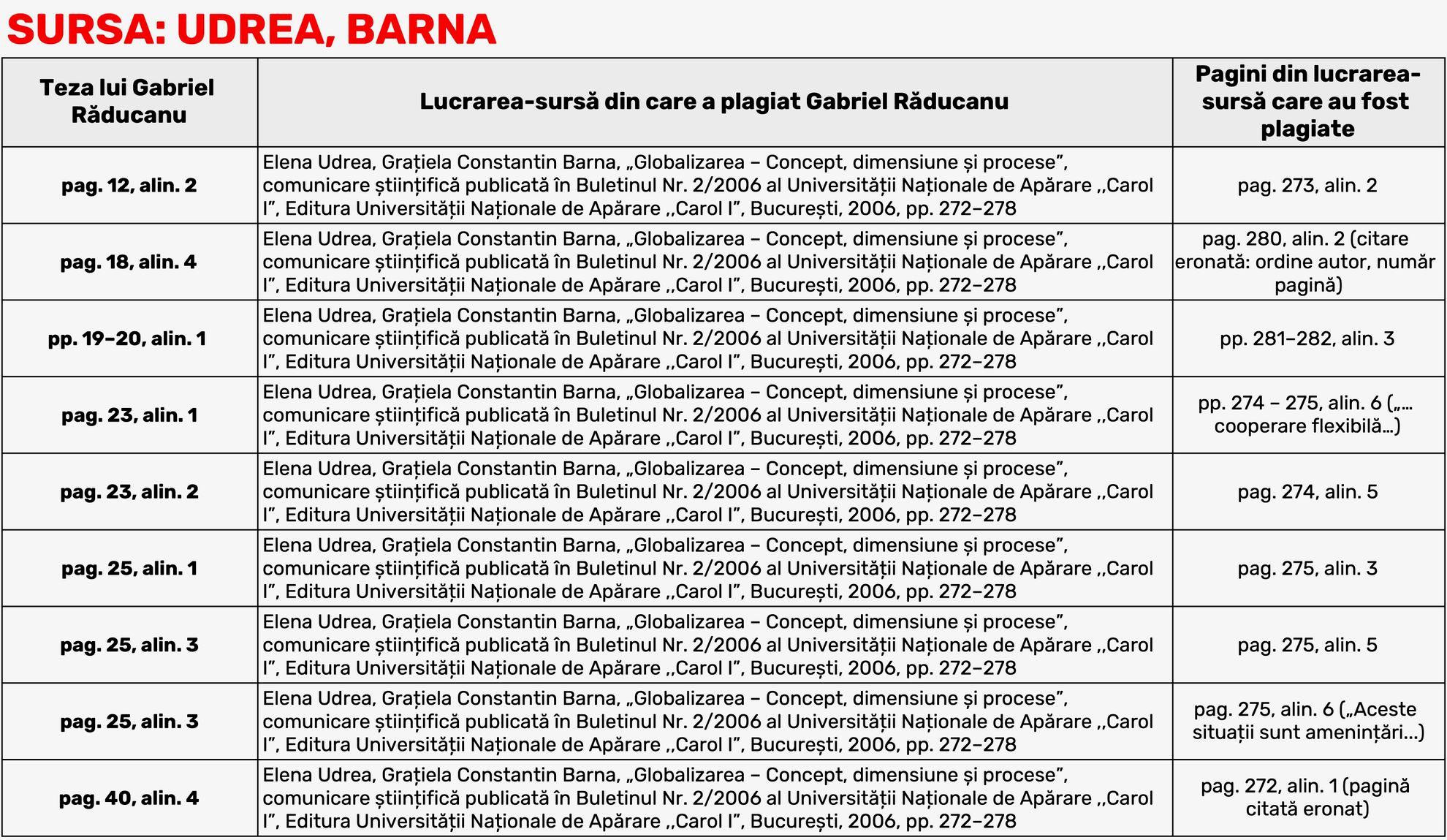 O sursă din care generalul Răducanu a plagiat este articolul „Globalizarea-Concept, dimensiune și procese” semnat în calitate de prim autor de Elena Udrea, fostă consilieră a președintelui Traian Băsescu și fost ministru al Turismului și al Dezvoltării.