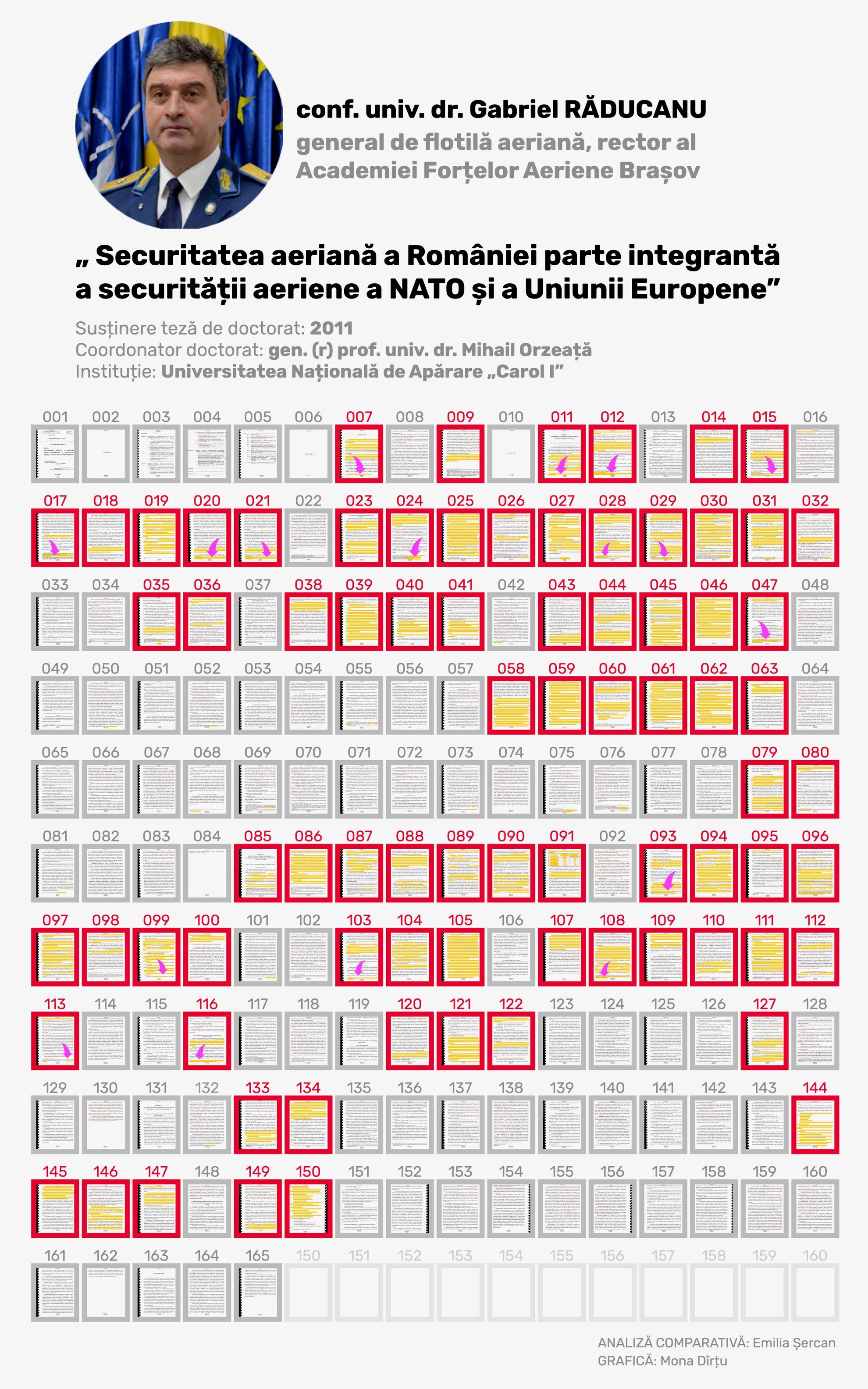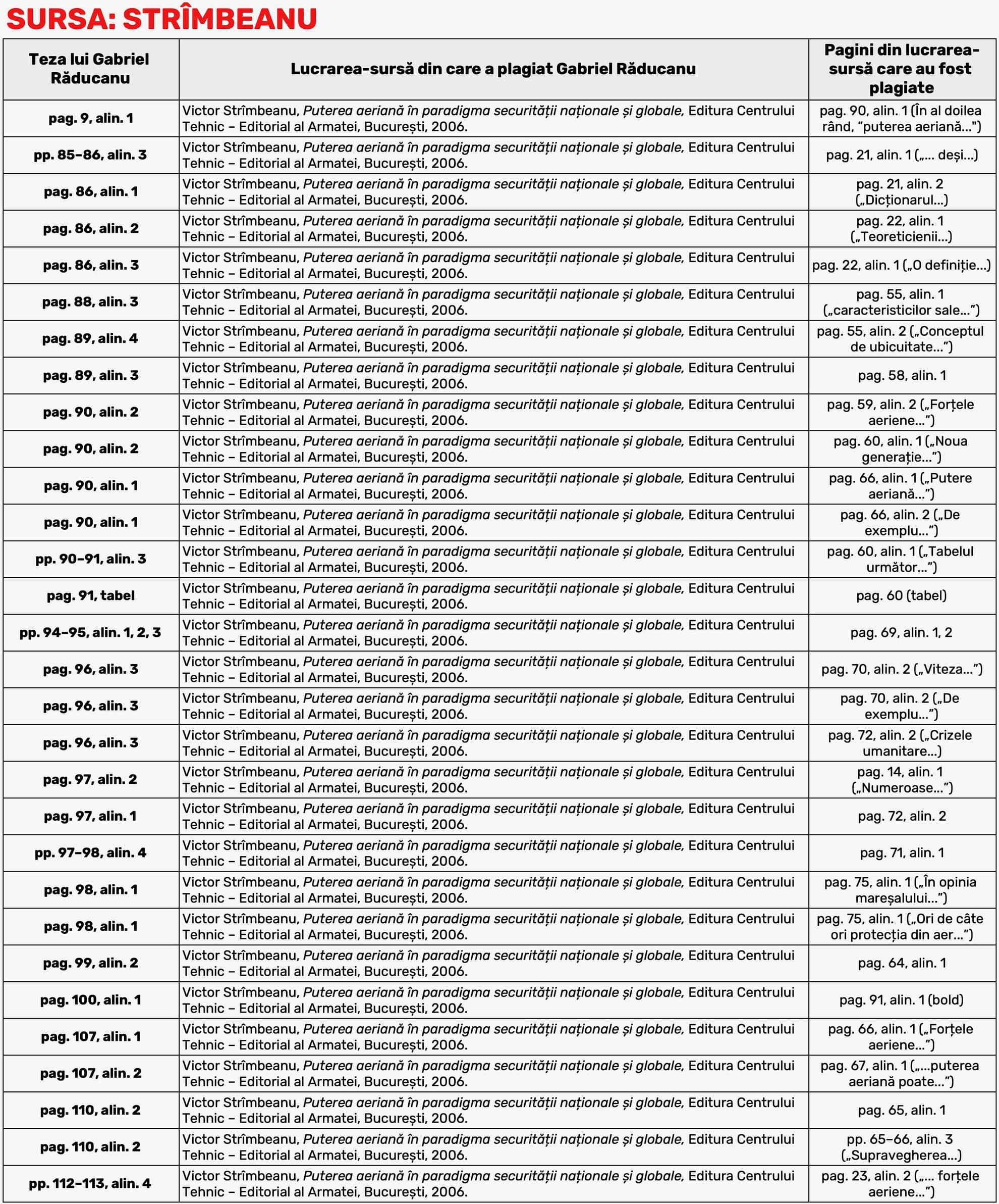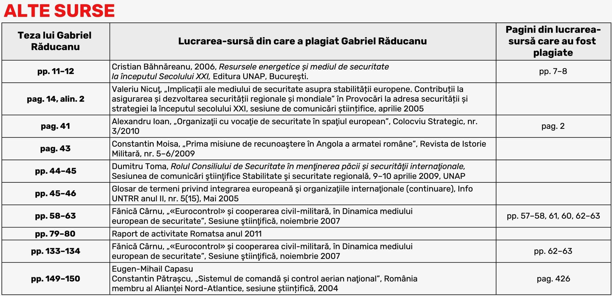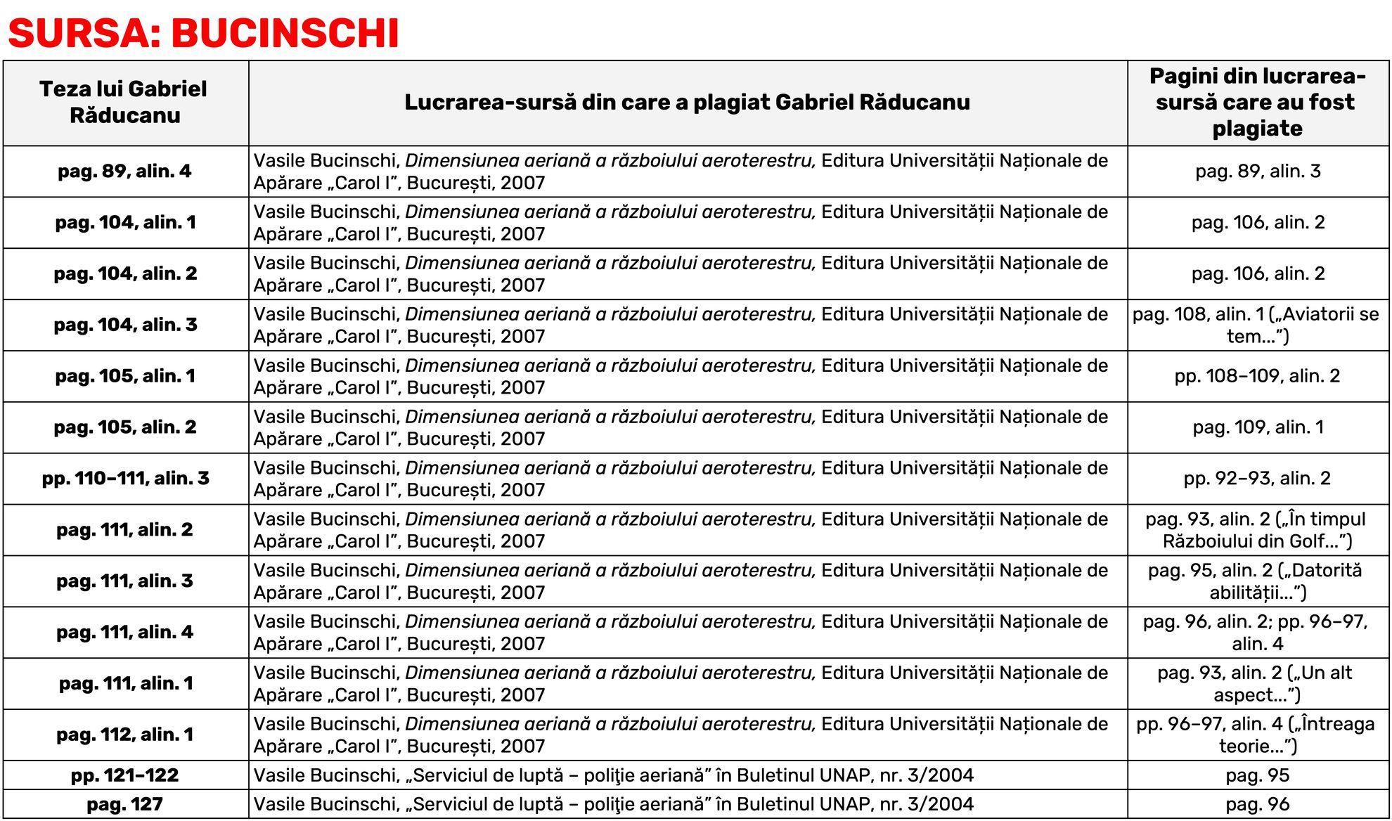 Alte câteva pagini sunt copiate din două lucrări semnate de fostul rector al AFA, generalul (r) prof. univ. dr. Vasile Bucinschi, unul dintre cei trei referenți care au aprobat acordarea titlului de doctor pentru Răducanu.