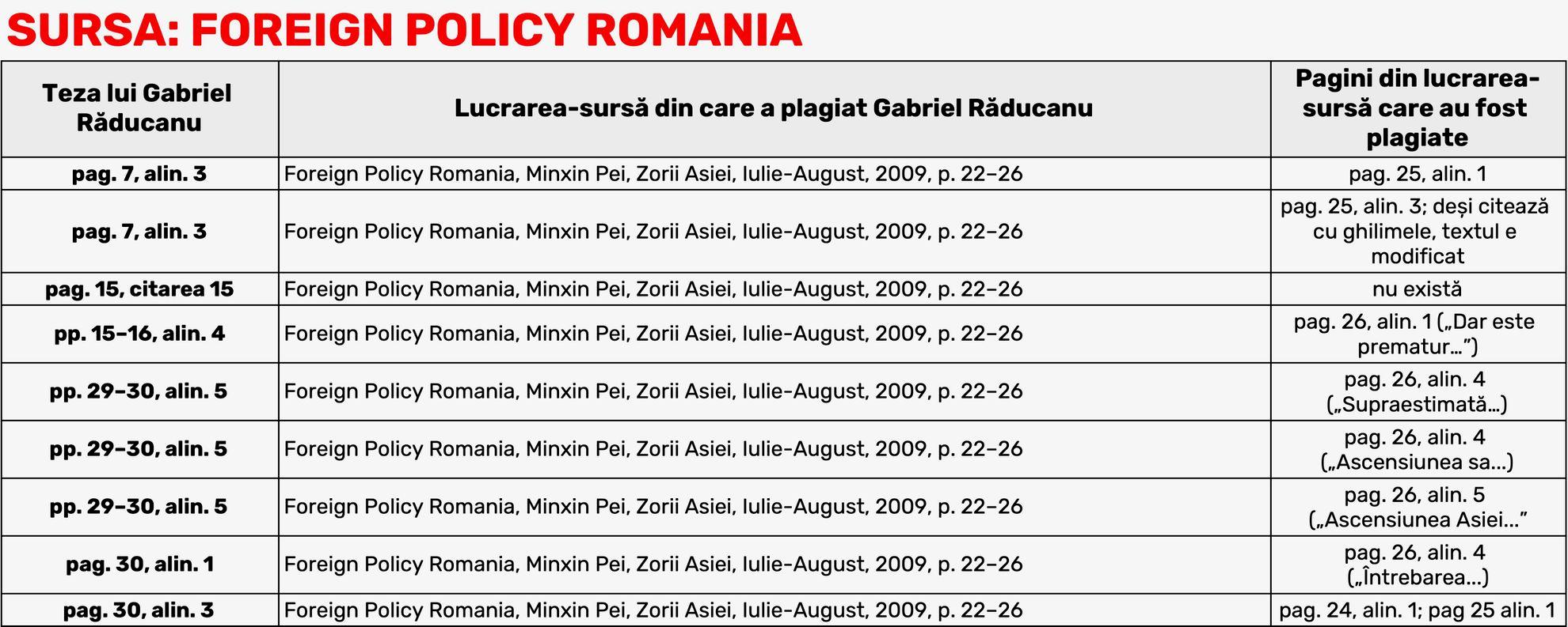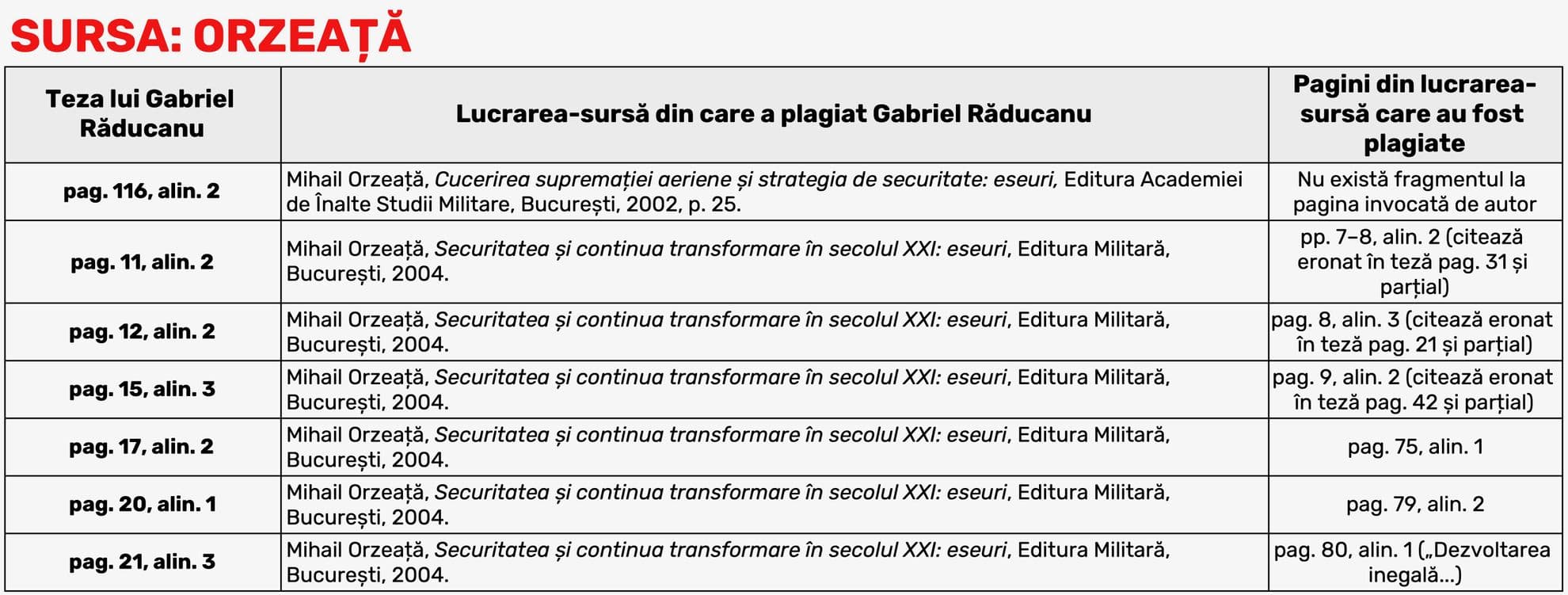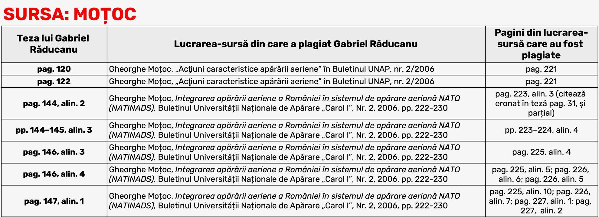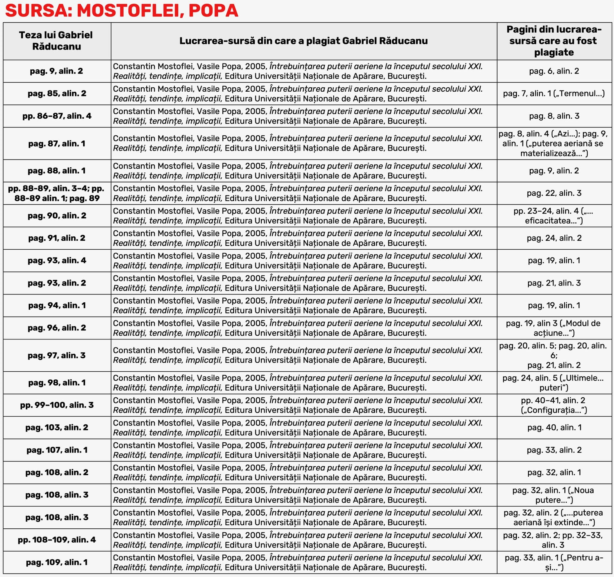 Alte câteva pagini sunt copiate din două lucrări semnate de fostul rector al AFA, generalul (r) prof. univ. dr. Vasile Bucinschi, unul dintre cei trei referenți care au aprobat acordarea titlului de doctor pentru Răducanu.