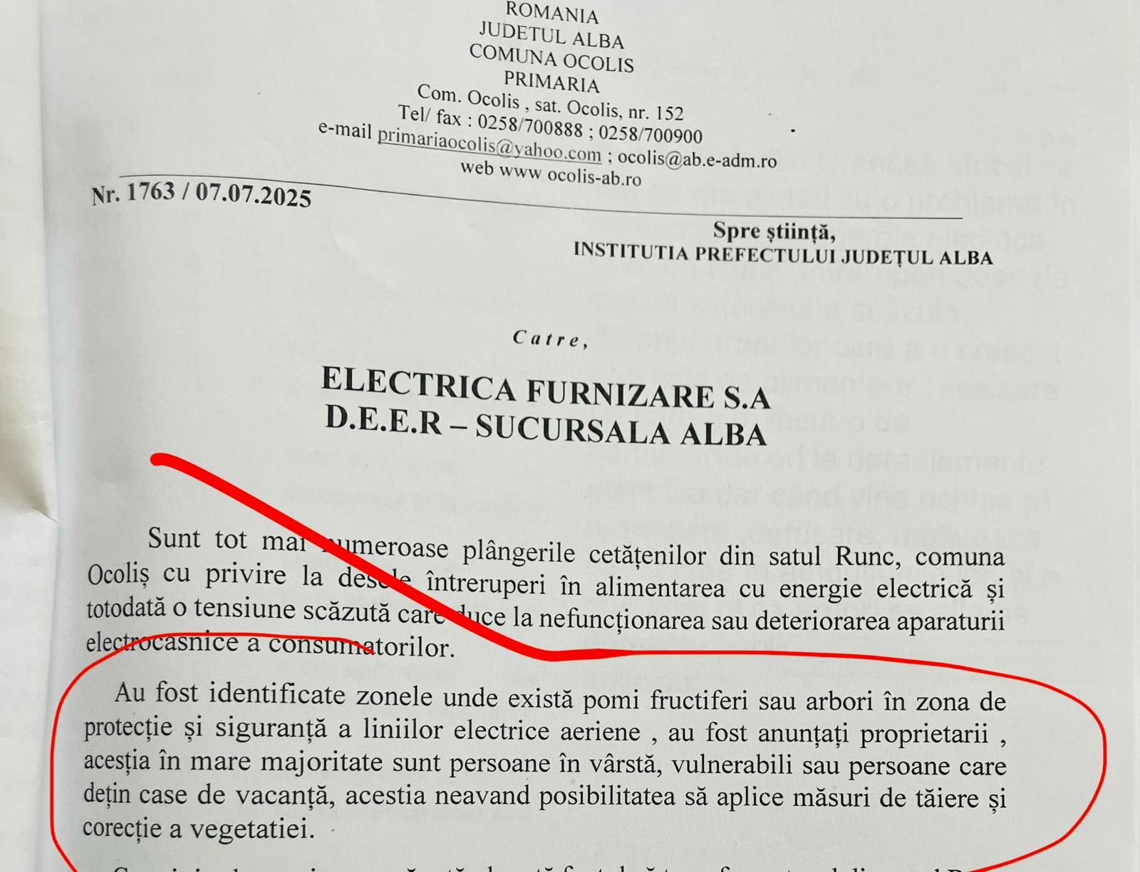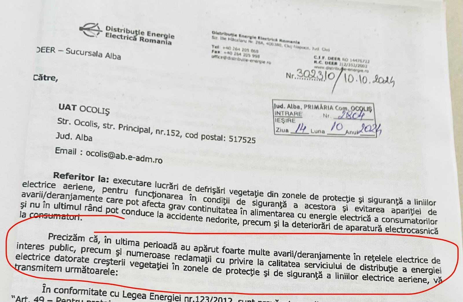 „Precizăm că în ultima perioadă au apărut foarte multe avarii/deranjamente în rețelele electrice de interes public precum și numeroase reclamații cu privire la calitatea serviciului de distribuție a energiei electrice datorate creșterii vegetației în zonele de protecție și de siguranță a liniilor a liniilor aeriene (...)”
